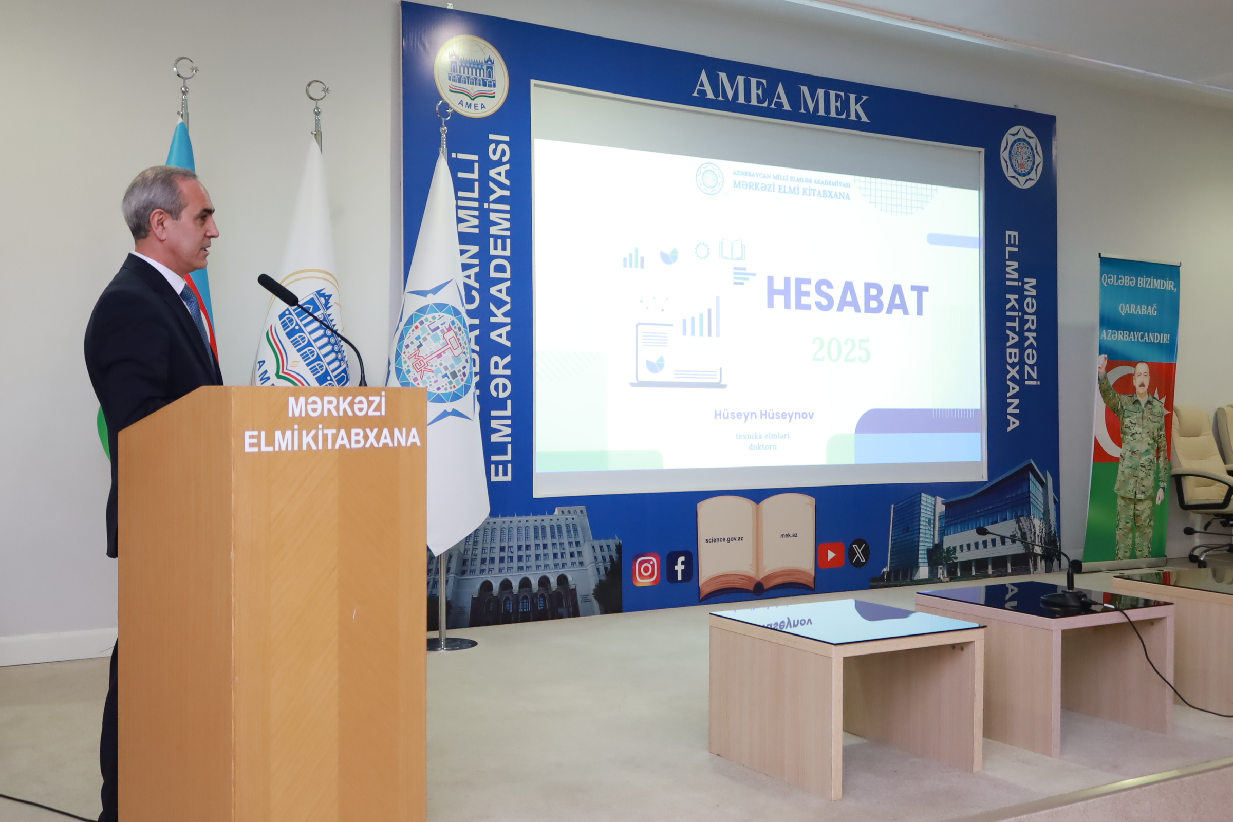 XQ xəbər verir ki, MEK-in direktoru texnika elmləri doktoru Hüseyn Hüseynov illik hesabat məruzəsi ilə çıxış edərək bildirib ki, 2025-ci il ərzində Mərkəzi Elmi Kitabxananın fəaliyyəti AMEA rəhbərliyinin qəbul etdiyi normativ sənədlərə uyğun şəkildə təşkil olunub. Kitabxananın fəaliyyət istiqamətləri Akademiyanın strateji inkişaf xəttinə uyğun formalaşdırılıb, elmi-informasiya təminatının gücləndirilməsi, rəqəmsallaşdırma işlərinin genişləndirilməsi və ictimai maarifləndirmə tədbirləri planlı şəkildə həyata keçirilib.