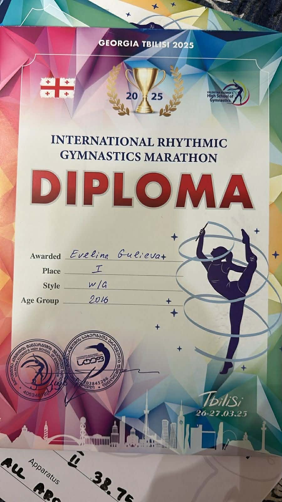 Soydaşımız Evelina Quliyeva Tbilisi şəhərində dörd yaşından bəri bədii gimnastika ilə məşğul olur və 72 saylı məktəbin 3-cü sinif şagirdidir. Əvvəlcə həvəskarlar qrupunda məşq edib, lakin xüsusi əzmkarlığı, zəhməti və məşqçinin tövsiyələrini dəqiq yerinə yetirməsi ilə tezliklə yüksək uğurlar qazanıb. Daimi zəhməti və qətiyyəti sayəsində tezliklə “İsani-Samqori Kompleks İdman Mərkəzi”nin idman qrupuna yazılıb, artıq müxtəlif beynəlxalq turnirlərdə və çempionatlarda fəal iştirak edir.
