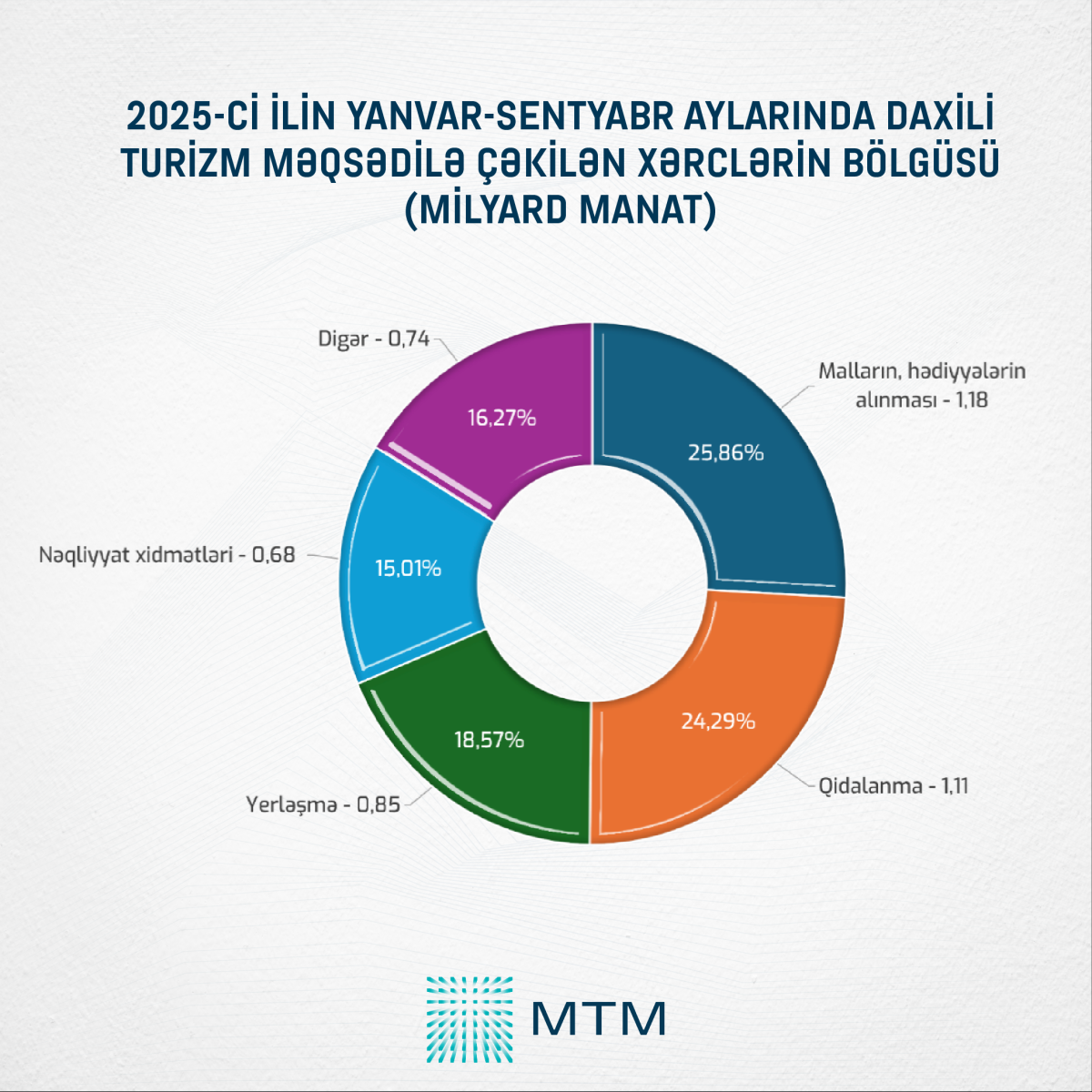 2025-ci ilin yanvar–sentyabr ayları üzrə ölkədaxili turizm səfərlərinin məqsədlər üzrə xərclər strukturuna nəzər yetirdikdə, ən yüksək xərcin “malların və hədiyyələrin alınması” istiqamətində qeydə alındığı görülür. Belə ki, bu məqsəd üzrə xərclər 1,18 mlrd manat təşkil edib ki, bu da müvafiq dövr ərzində çəkilən ümumi xərclərin 25,86%-nə bərabərdir. Müvafiq dövr üzrə ikinci ən böyük xərc istiqaməti “qidalanma” olub. Bu sahədə xərclər 1,11 mlrd manat təşkil etməklə ümumi xərclərin 24,29%-ni formalaşdırıb. “Yerləşmə” məqsədli xərclər 0,85 mlrd manat olmaqla ümumi xərclərin 18,57%-ni təşkil edib. “Nəqliyyat xidmətləri” üzrə xərclər 0,68 mlrd manat səviyyəsində qeydə alınıb ki, bu da ümumi xərclərin 15,01%-nə bərabərdir. “Digər məqsədli” xərclər isə 0,74 mlrd manat olmaqla ümumi xərclərin 16,27%-ni təşkil edib.