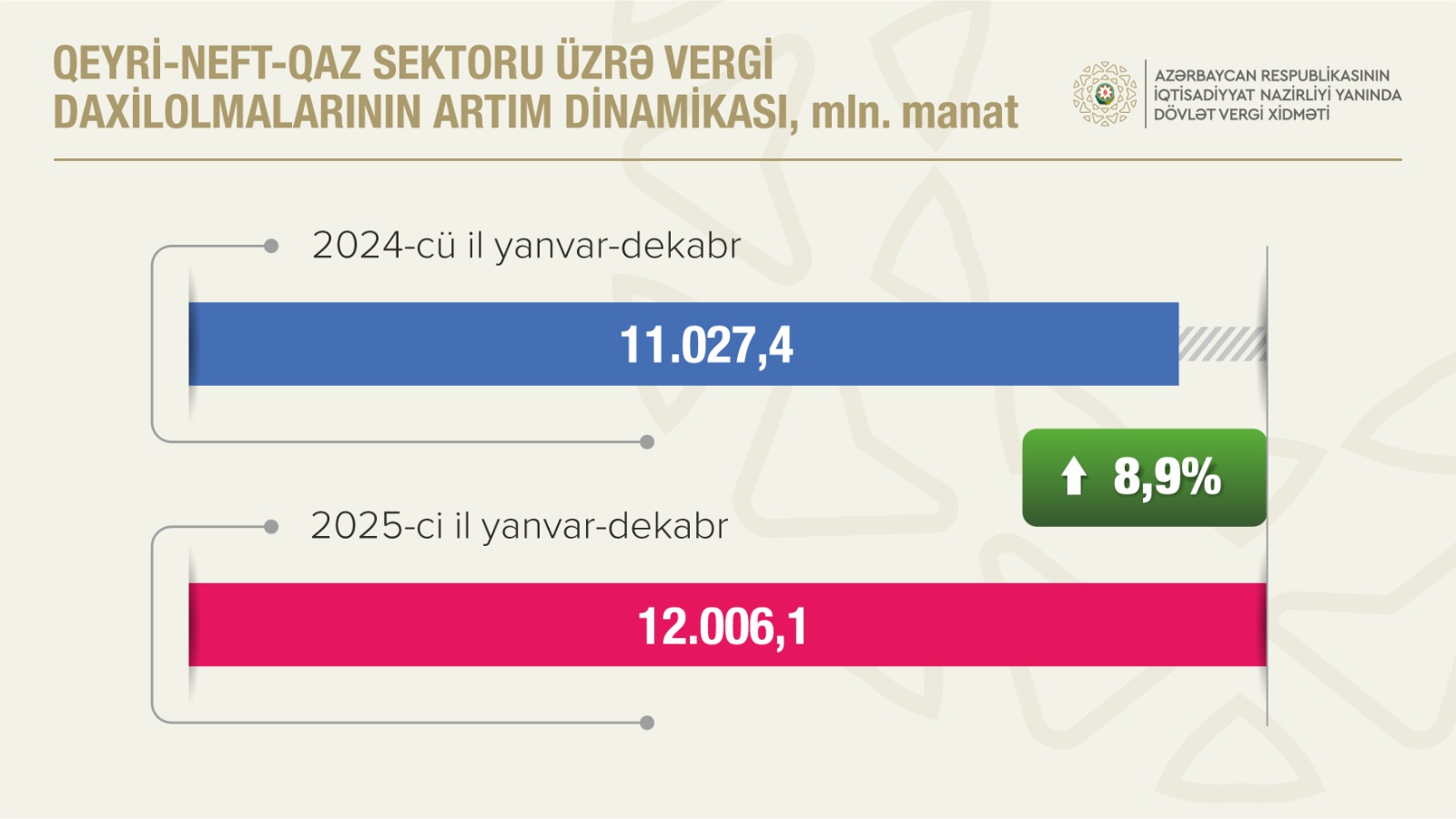 Qeyri-neft-qaz sektorundan daxilolmalar 12 milyard 6 milyon manatdan çox olub və büdcəyə proqnozdan əlavə 336,1 milyon manat vəsait ödənilib. Əvvəlki ilə nisbətən bu sektordan vergi daxilolmaları 978,7 milyon manat və ya 8,9 faiz artıb.