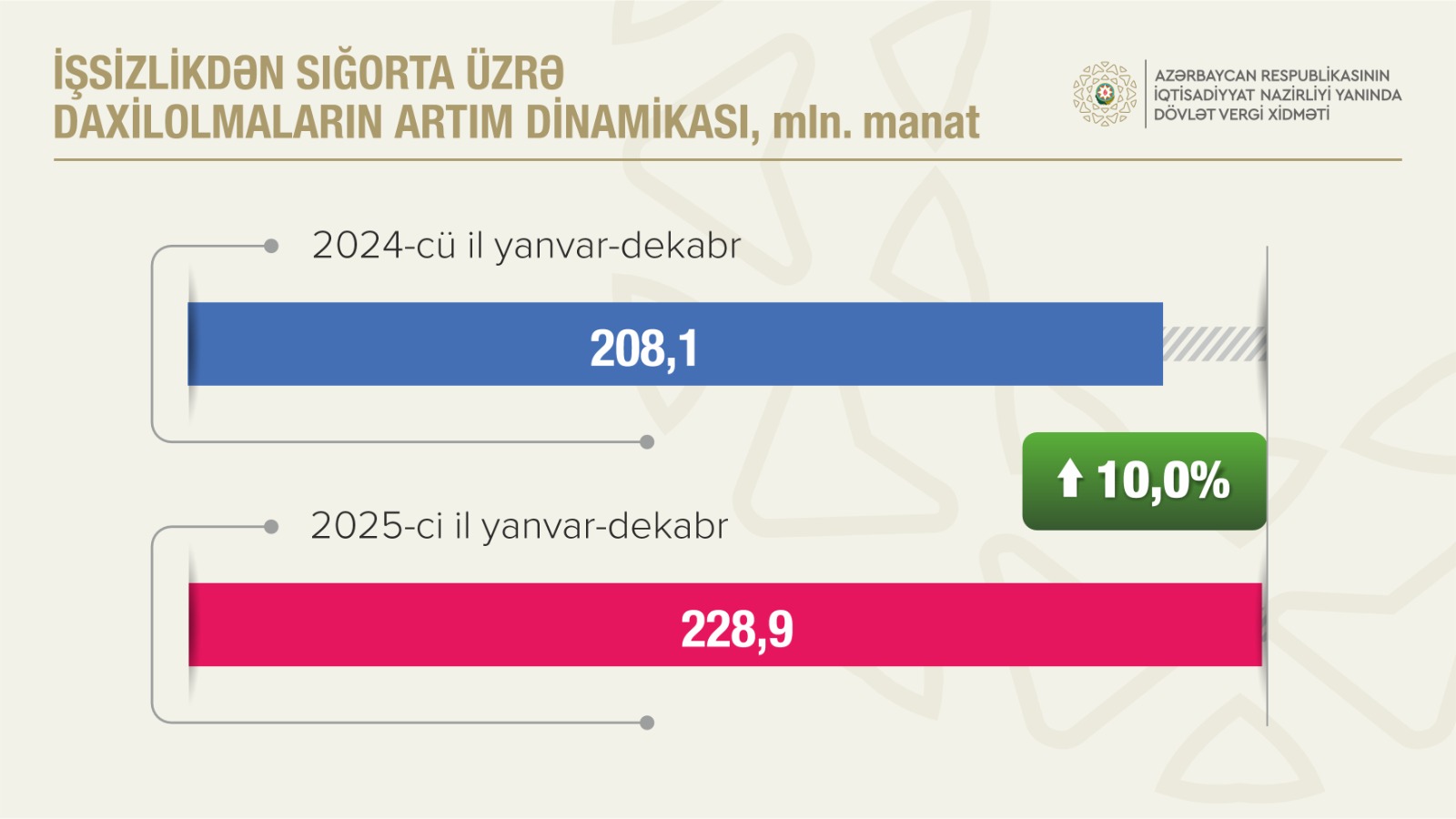 İşsizlikdən sığorta haqları üzrə daxilolmalar 2024-cü illə müqayisədə 10,0 faiz artıb və 228,9 milyon manata yaxın olub. Qeyri-büdcə təşkilatları üzrə daxilolmalar 10,5 faiz artaraq 173,3 milyon manatdan çox təşkil edib.