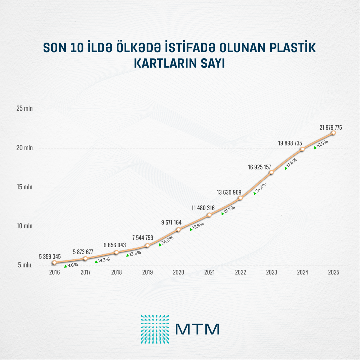 2025-ci ilin sonuna olan rəsmi göstəricilərə əsasən, Azərbaycanda dövriyyədə olan plastik kartların sayı 21 milyon 979 min 775 ədədə çatıb. Bu göstərici 2024-cü illə müqayisədə 2 milyon 81 min 40 ədəd və ya 10,5 faiz artım deməkdir.