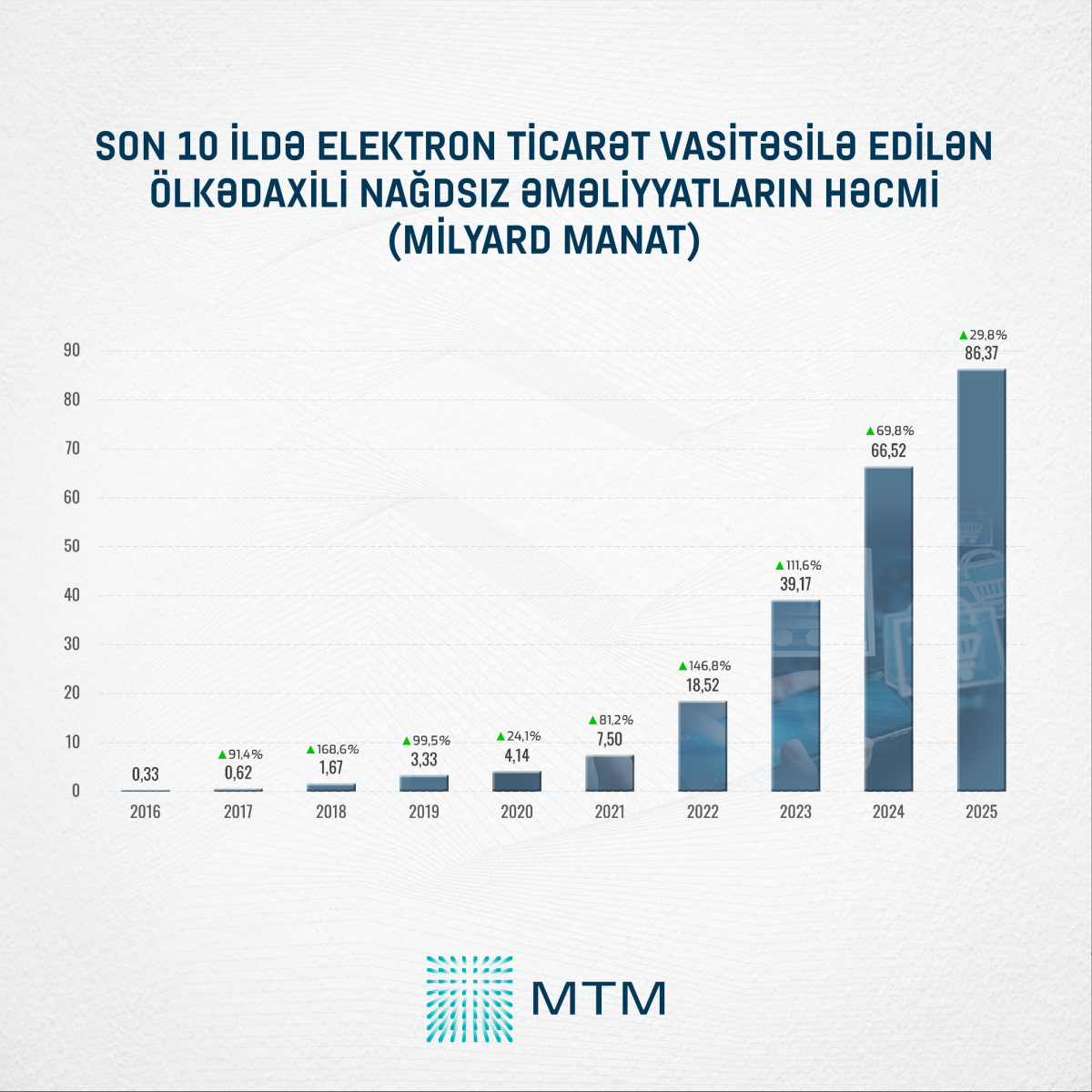 Media Təhlil Mərkəzinin (MTM) Azərbaycan Mərkəzi Bankının açıqladığı rəsmi statistik göstəricilər əsasında apardığı təhlilə görə, 2025-ci ildə ölkə daxilində nağdsız ödənişlərin həcmi 99,1 milyard manat təşkil edib. Bu göstərici 2024-cü illə müqayisədə 25,6 faiz və ya 20,22 milyard manat artım deməkdir.