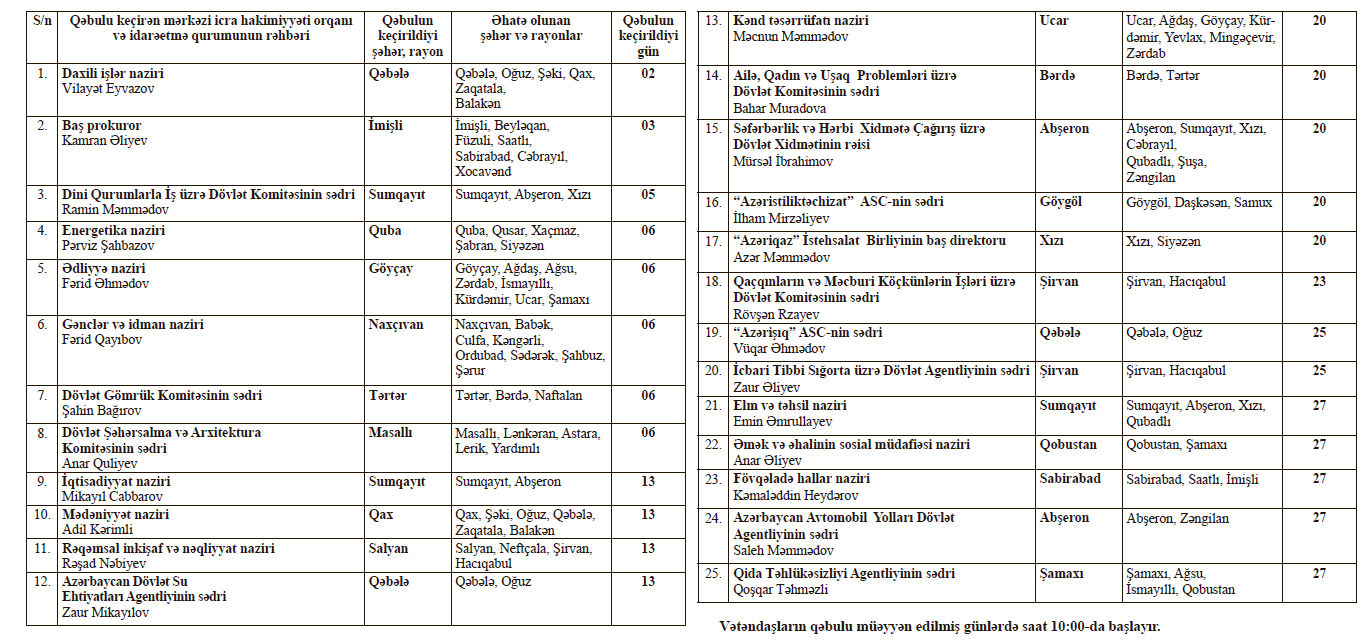 Mərkəzi icra hakimiyyəti orqanlarının və digər idarəetmə qurumlarının rəhbərləri tərəfindən 2026-cı ilin fevral ayında şəhər və rayonlarda keçiriləcək vətəndaşların qəbulu cədvəli