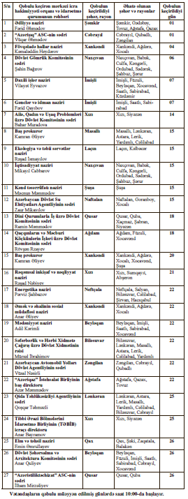 Mərkəzi icra hakimiyyəti orqanlarının və digər idarəetmə qurumlarının rəhbərləri tərəfindən 2026-cı ilin may ayında şəhər və rayonlarda keçiriləcək vətəndaşların qəbulu cədvəli