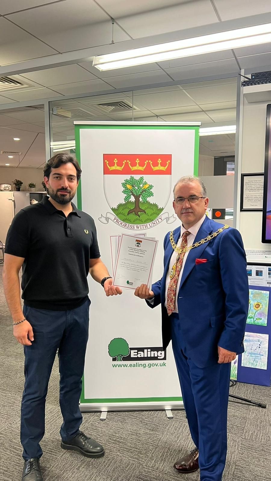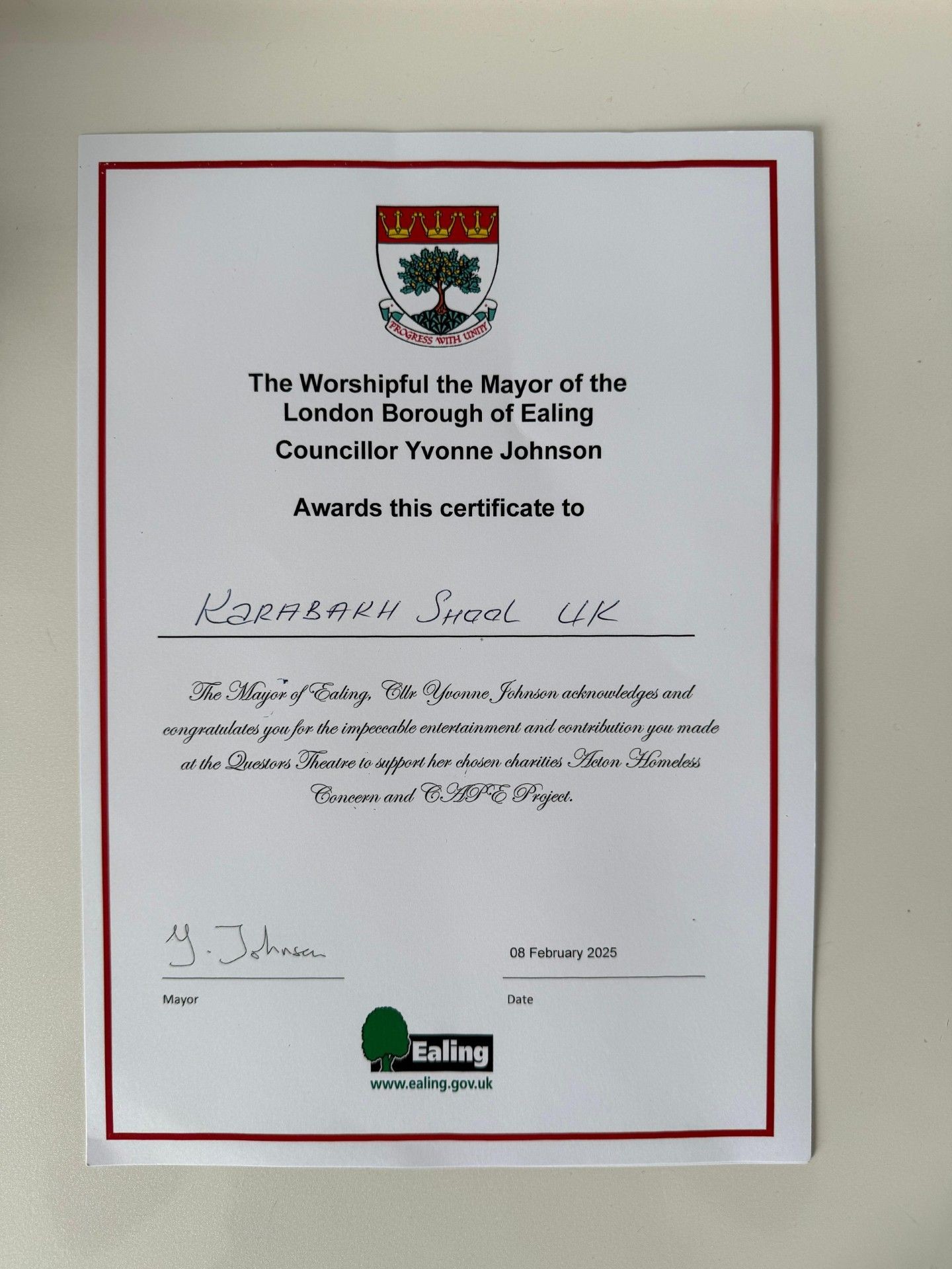 Bu uğurlu çıxışa görə, 2025-ci il 7 sentyabr tarixində mer Yvonne Johnson Qarabağ Məktəbinə xüsusi təşəkkür sertifikatı təqdim edib. Sertifikat icmamızın fəal üzvü Fərid Əliyevə təqdim olunub. Görüş zamanı Fərid Əliyev sertifikata görə təşəkkür edib, mer və digər qonaqlara məktəbin fəaliyyəti barədə məlumat verib. Qeyd edək ki, Britaniya Azərbaycanlıları Cəmiyyətinin (BAC) 2021-ci ilin sentyabrında təsis etdiyi Qarabağ məktəbi Diasporla İş üzrə Dövlət Komitəsinin dəstəyi ilə fəaliyyət göstərir.