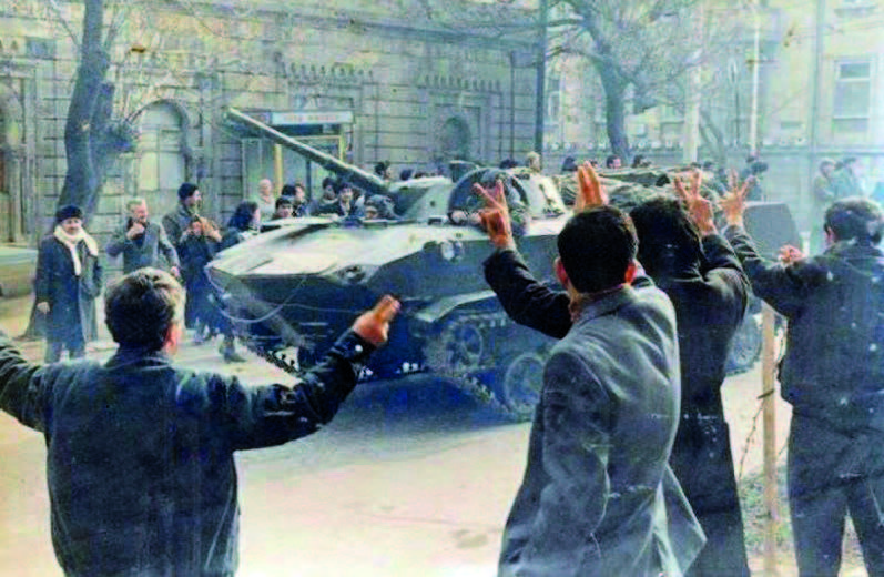 Oradan “Beşmərtəbə” tərəfə, sonra da Prezident Aparatı istiqamətində bir neçə kilometr yolu piyada getdik. Küçələr tanklar və zirehli texnikalarla dolu idi. Ətrafda əzilmiş vəziyyətdə avtobus və yük maşınları vardı. Yolda bizi bir neçə dəfə saxladılar, hər dəfə jurnalist vəsiqələrimizi göstərməli olduq. Yaxşı ki, həbs etməyib buraxdılar.