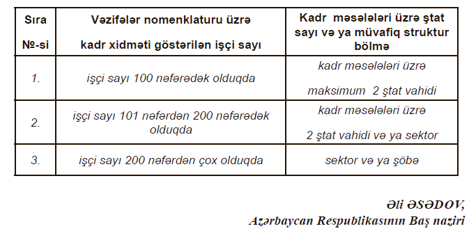 “1-1. Dövlət orqanlarında (mərkəzi icra hakimiyyəti orqanlarında, mərkəzi icra hakimiyyəti orqanlarının yanında yaradılan dövlət agentlikləri və dövlət xidmətlərində, mərkəzi icra hakimiyyəti orqanlarının tabeliyində olan orqanlarda) kadr qurumları həmin orqanların mövcud ştat sayı dairəsində işçilərinin sayına mütənasib olaraq aşağıdakı cədvələ uyğun olaraq təşkil edilir: