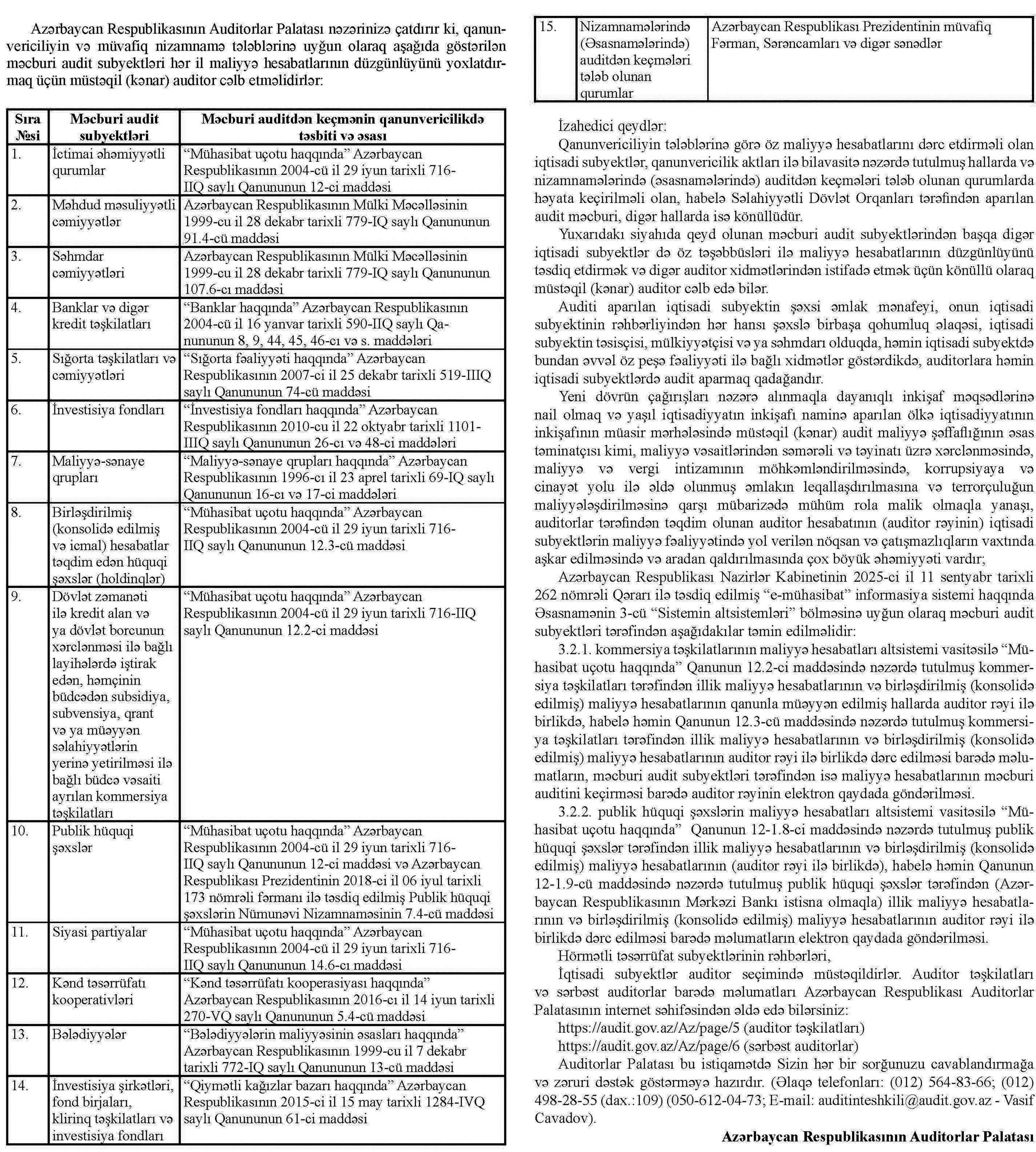 10:58 16.12.2025Məcburi audit subyektləri rəhbərlərinin nəzərinə!