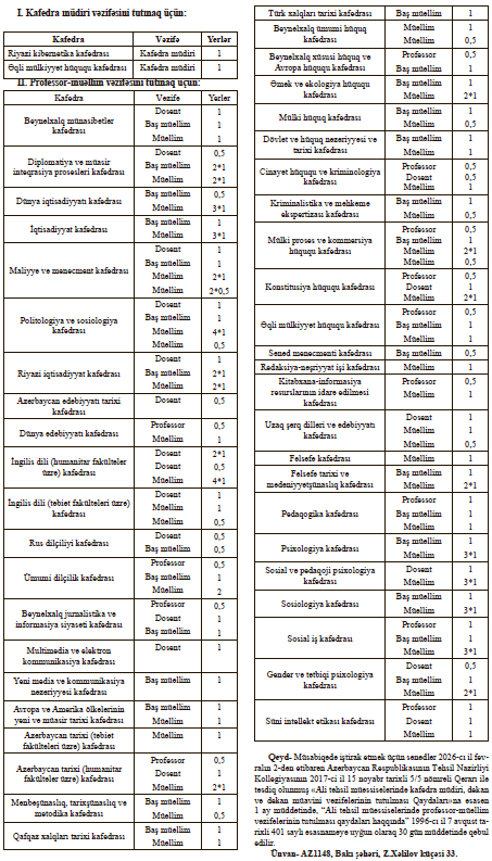 Azərbaycan Respublikası Elm və Təhsil Nazirliyi Bakı Dövlət Universiteti aşağıdakı fakültə və kafedralarda boş olan vəzifələri tutmaq üçün müsabiqə elan edir