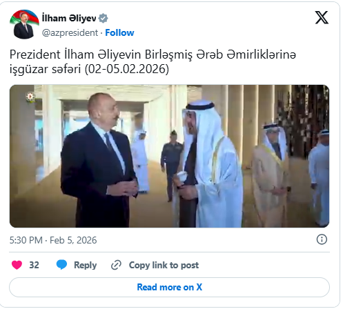 Prezident İlham Əliyevin sosial media hesabında Birləşmiş Ərəb Əmirliklərinə işgüzar səfəri ilə bağlı videoçarx paylaşılıb.