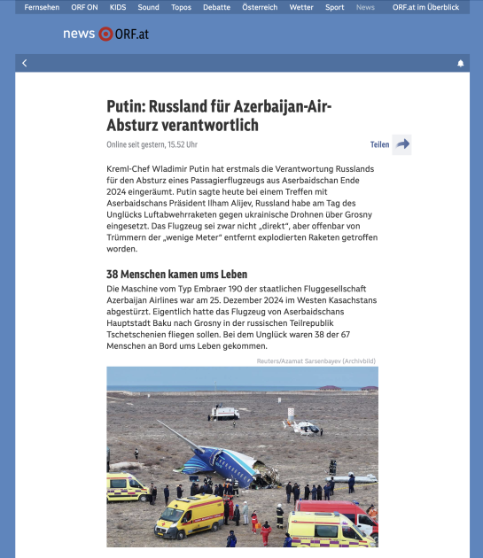 Məqalələrdə 2024-cü il dekabrın 25-də Qroznı istiqamətində reysi həyata keçirən AZAL təyyarəsinin Rusiya hava hücumundan müdafiə qüvvələri tərəfindən vurulması və Qazaxıstanın Aktau şəhəri yaxınlığında qəzaya uğraması barədə detallar təqdim olunub.