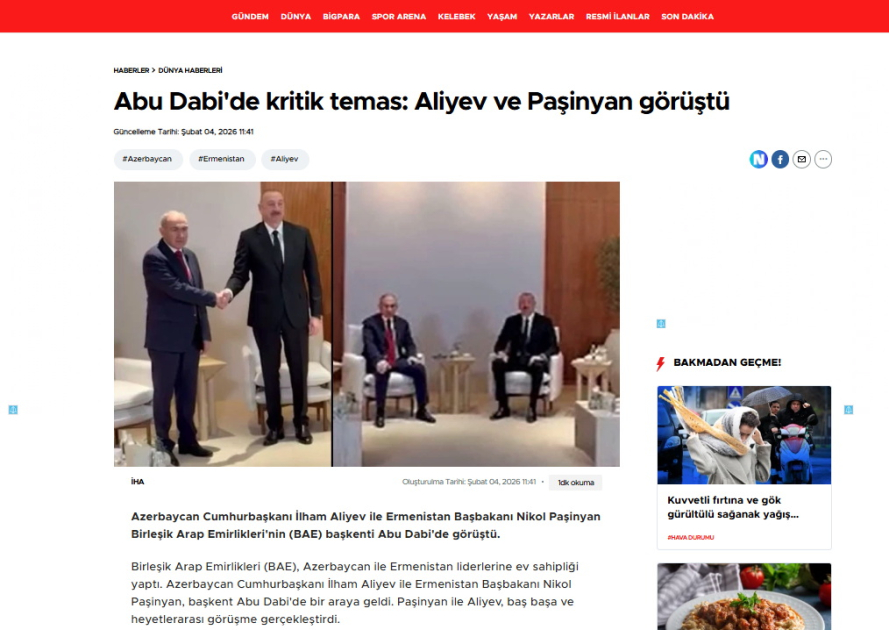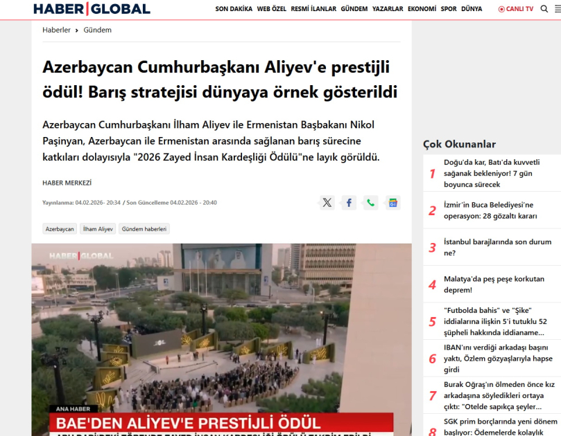 Qardaş ölkənin “İhlas” xəbər agentliyinin və “Haber Global” telekanalının saytında, həmçinin “Akşam”, “Yeni Akit”, “Birgün” qəzetlərində, “Haber365”, “Haberlerim”, “Son dakikam”, “Haber sitesi” və geniş auditoriyaya malik digər portallarda Prezident İlham Əliyevə “Zayed İnsan Qardaşlığı Mükafatı”nın təqdim olunması, həmçinin onun Ermənistanın Baş naziri ilə keçirdiyi görüş barədə materiallar dərc olunub.