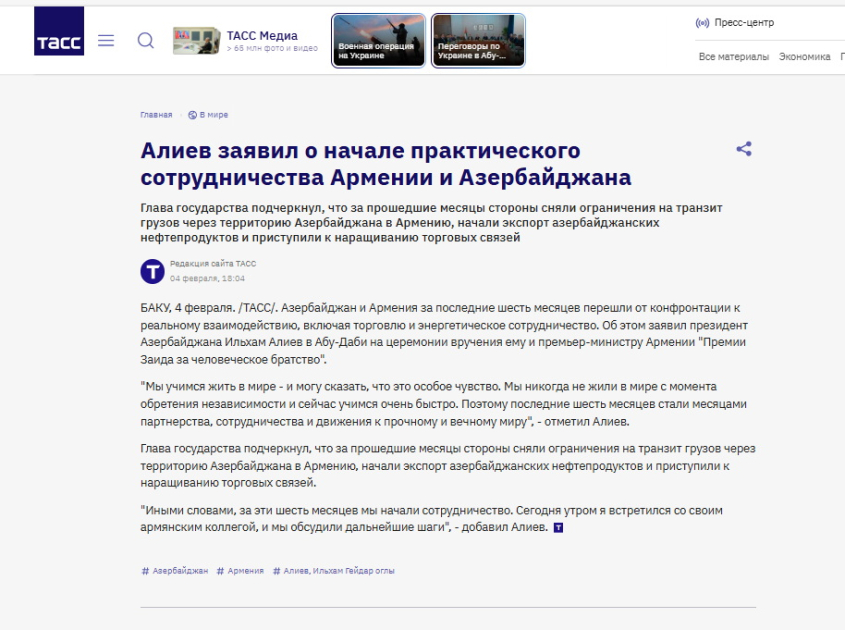 Rusiyanın TASS agentliyinin saytında dərc olunmuş “Əliyev Azərbaycan ilə Ermənistan arasında praktik əməkdaşlığın başladığını bəyan edib” sərlövhəli yazıda qeyd olunur ki, “Zayed İnsan Qardaşlığı Mükafatı”na layiq görülən Azərbaycan Prezidenti son altı ay ərzində Bakı ilə İrəvan arasında münasibətlərin konfrontasiyadan qarşılıqlı fəaliyyət mərhələsinə keçdiyini bildirib. Rusiyanın rəsmi agentliyi dövlətimizin başçısının sözlərini sitat gətirib: “Biz təkcə Azərbaycan ərazisindən Ermənistana yük daşımalarına qoyulmuş məhdudiyyətləri aradan qaldırmadıq, eyni zamanda, Ermənistana neft məhsullarının ixracına da başladıq. Yəni bu altı ay ərzində biz əməkdaşlığa başlamışıq. Hazırda ticarət əlaqələrimizi genişləndiririk. Bu səhər ermənistanlı həmkarımla görüşdüm və gələcək addımlarımızı müzakirə etdik”.
