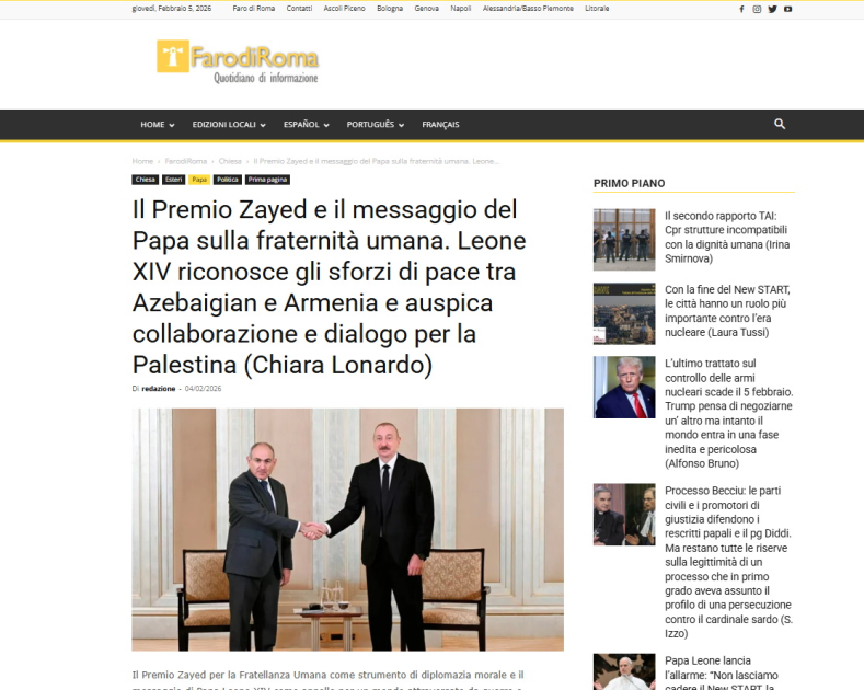 Vatikanın rəsmi “Vatican News” nəşri də Prezident İlham Əliyevə “Zayed İnsan Qardaşlığı Mükafatı”nın təqdim olunması, həmçinin dövlətimizin başçısının Ermənistanın Baş naziri ilə keçirdiyi görüş barədə material dərc edib.