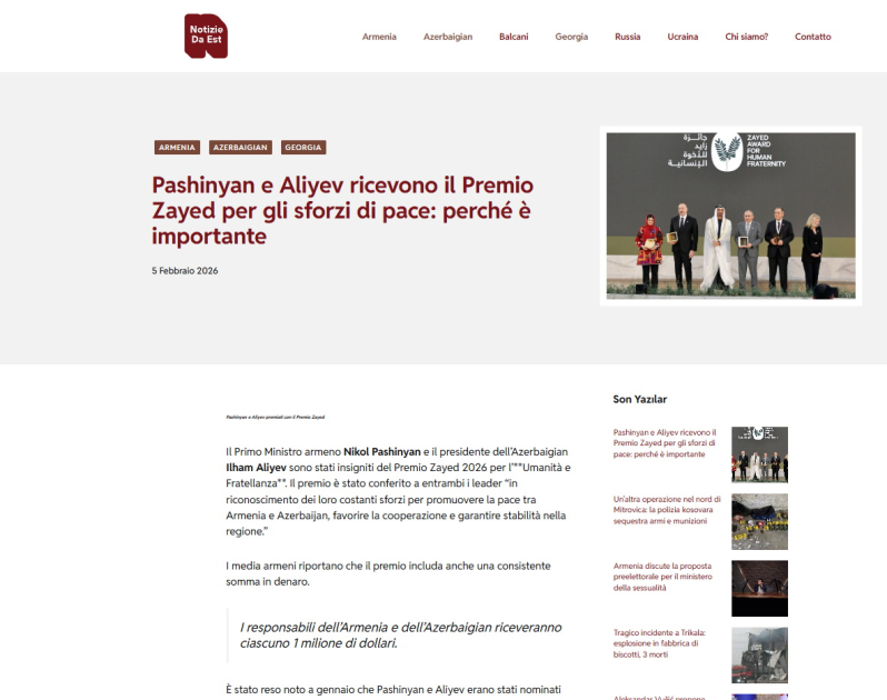 Azərbaycan Prezidentinin Əbu-Dabi səfəri İtaliyanın nüfuzlu media orqanlarında da işıqlandırılıb. Bu ölkənin “Notizie da Est”, “Latestata”, “Farodiroma”, “Parroççia” qəzetləri, həmçinin “Agenzie Nova” agentliyi Prezident İlham Əliyevə “Zayed İnsan Qardaşlığı Mükafatı”nın təqdim olunması, həmçinin dövlətimizin başçısının Ermənistanın Baş naziri ilə keçirdiyi görüş barədə materiallar dərc ediblər. Yazılarda qeyd olunub ki, Azərbaycan Prezidenti Ermənistanla 30 ildən artıq davam edən münaqişəyə son qoyub, bununla da Cənubi Qafqaz regionunun inkişafına töhfə verir. Vurğulanıb ki, məhz sülh istiqamətində səylərinə görə Prezident İlham Əliyev və Ermənistanın Baş naziri Nikol Paşinyan bu nüfuzlu mükafata layiq görülüblər.