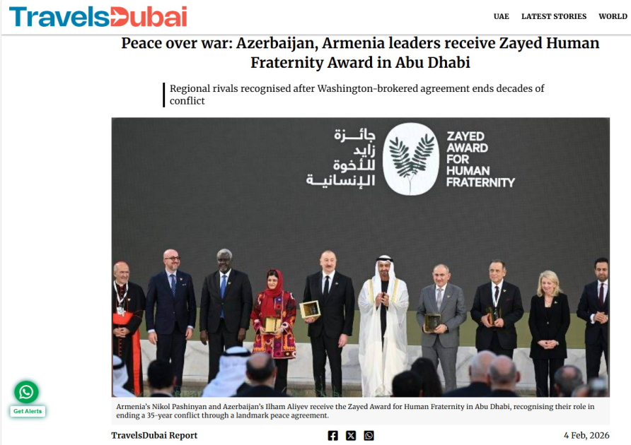 BƏƏ-nin “Al İttihad”, “The Travel Dubai”, “UAE Barq”, “Al Vatan”, “Nabd” qəzet və portalları da Prezident İlham Əliyevə “Zayed İnsan Qardaşlığı Mükafatı”nın təqdim olunması barədə materiallar dərc edib. Qeyd olunub ki, Azərbaycanın dövlət başçısı dinlərarası dialoqun inkişafına verdikləri töhfəyə, həmçinin sivilizasiyaların bir-birinə daha da yaxınlaşması istiqamətində göstərdikləri səylərə görə Əl-Əzhərin böyük imamı, doktor Əhməd Əl-Tayyibə və Roma Papası, Zati-müqəddəsləri Leoya dərin minnətdarlığını bildirib, həmçinin mərasimə ünvanladıqları xoş müraciətlərində bir daha Azərbaycan və Ermənistan arasında sülhün əhəmiyyətini vurğulayan bütün həmkarlarına təşəkkür edib. Dövlətimizin başçısının sözləri də sitat gətirilib: “Bu sülh təkcə iki ölkə üçün deyil, daha geniş region üçün də böyük əhəmiyyət kəsb edir. Biz 30 ildən artıq müddətdə müharibə şəraitində olmuşuq. İndi isə artıq altı aydır ki, sülh şəraitində yaşayırıq”.