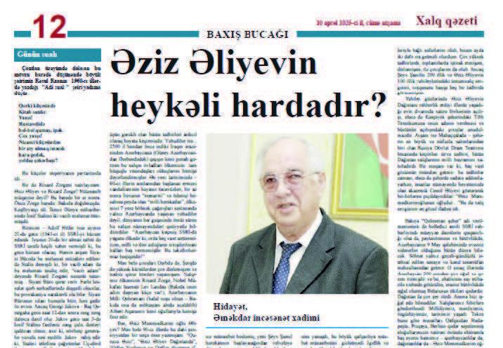 Adını çəkdiyim məqaləsi də sözlərimin haqlı olduğunu bir daha sübut edir. Məqalədə irəli sürülən Əziz Əliyevə abidə qoyulması ilə bağlı təklifini mən də ürəkdən dəstəkləyirəm.
