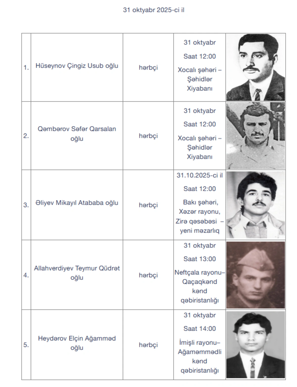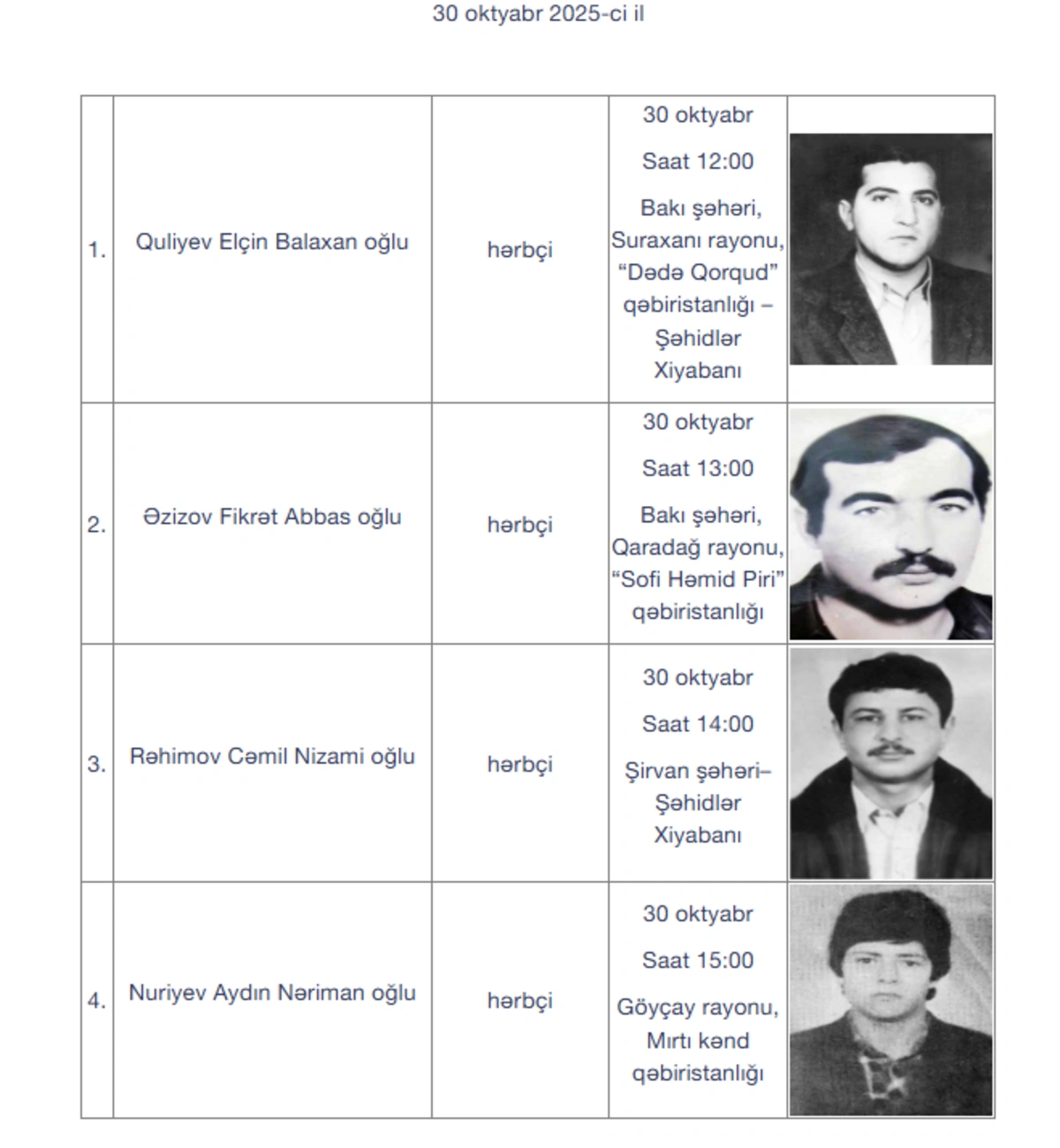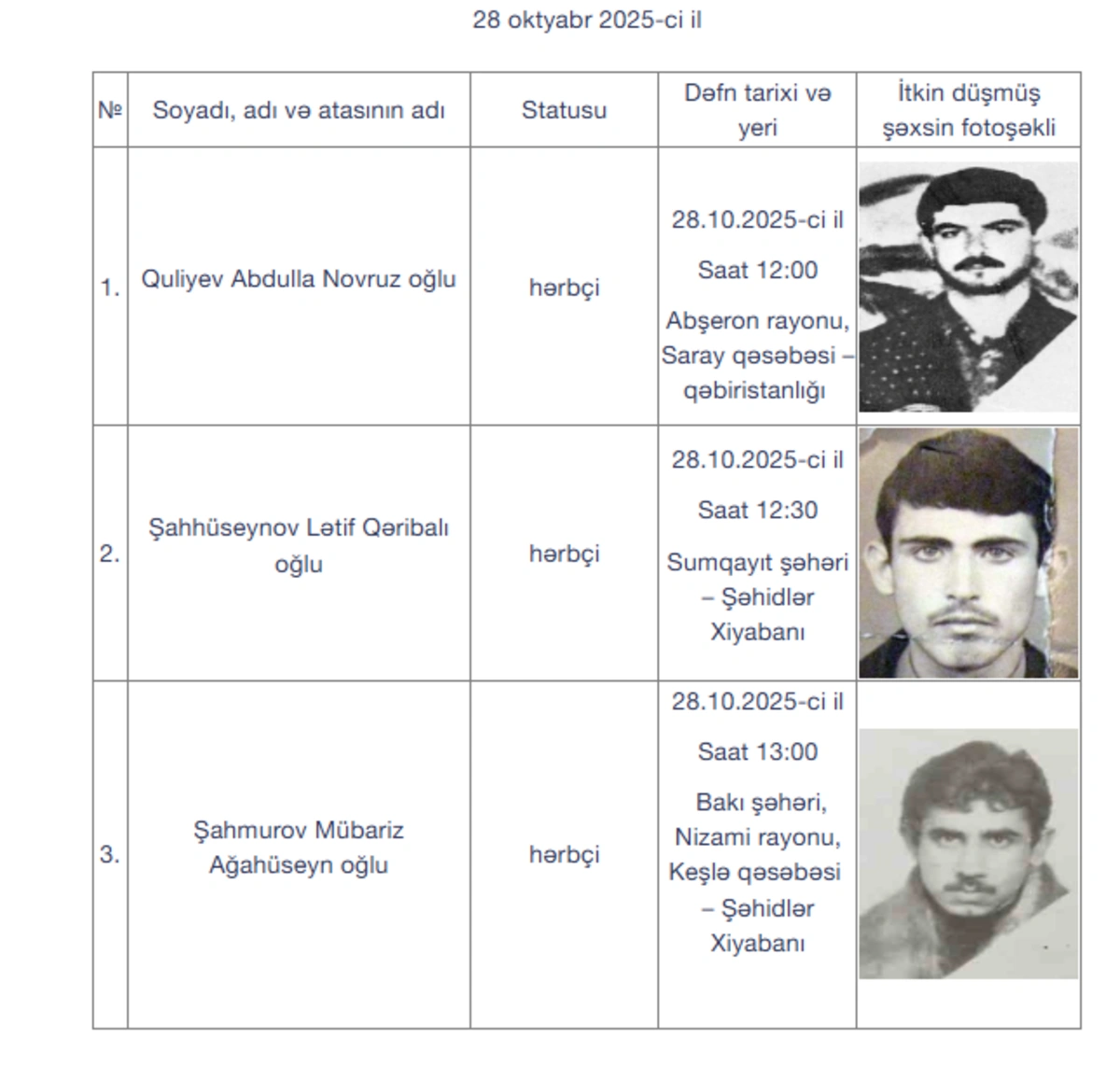 İtkin şəhidlər oktyabrın 28-i, 29-u, 30-u və 31-də Bakı və regionlarda dəfn olunacaqlar.