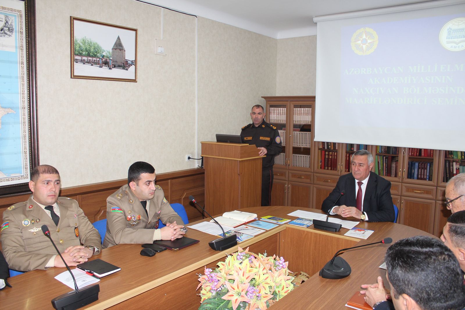 Azərbaycan Milli Elmlər Akademiyasının Naxçıvan Bölməsində Naxçıvan Muxtar Respublikası Fövqəladə Hallar Nazirliyinin təşkilatçılığı ilə “Fövqəladə halların ətraf mühitə və insanlara olan təsirləri, fövqəladə hallar zamanı davranış və yanğın təhlükəsizliyi qaydaları, dəm qazı təhlükəsindən qorunmanın yolları” mövzusunda maarifləndirici seminar keçirilib.