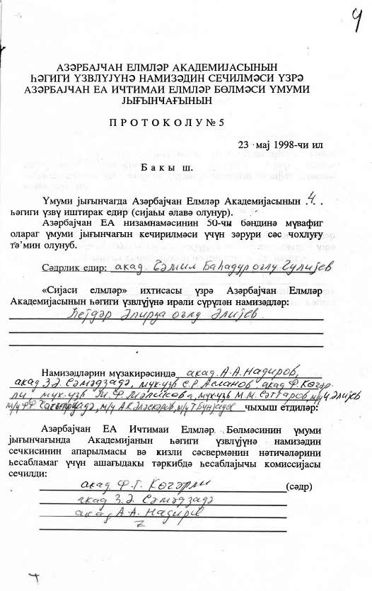 Görkəmli dövlət xadimi Heydər Əliyevin Akademiyanın həqiqi üzvlüyünə seçilməsinə dair seçkinin keçirilməsi üçün Nizamnaməyə uyğun olaraq 23 may 1998-ci il tarixdə çağırılan AEA İctimai Elmlər Bölməsinin iclasında Bölmədə təmsil olunan akademiklər görkəmli dövlət xadimi Heydər Əliyevin bu akademik qurumun siyasi elmlər üzrə həqiqi üzv seçilməsi məsələsini müzakirə edərək, böyük məmnuniyyətlə təklif edilən qərarın lehinə səs vermişlər. AEA-nın İctimai Elmlər Bölməsinin Ümumi Yığıncağının akademik Cəmil Quliyevin sədrliyi ilə keçirilmiş 23 may 1998-ci il tarixli iclasında çıxış edən AEA-nın həqiqi üzvləri: Asəf Nadirov, Ziyad Səmədzadə, Firudin Köçərli, müxbir üzvlər: Səlvər Aslanov, Mənsumə Məlikova, Məqsəd Səttarov, İqrar Əliyev, Teymur Bünyadov, Ağasəlim Ələsgərov, Fuad Qasımzadə kimi tanınmış elm adamları görkəmli dövlət xadimi Heydər Əliyevin xalqımız və dövlətimiz qarşısındakı böyük xidmətlərini yüksək qiymətləndirdiklərini bildirmiş, onun geniş siyasi dünyagörüşü və dünya siyasətindəki yeri və mövqeyi haqqında elmi cəhətdən əsaslandırılmış fikirlər irəli sürmüşlər. AEA-nın İctimai Elmlər Bölməsinin 23 may 1998-ci il tarixli 3 saylı protokolundan görünür ki, akademik Firudin Köçərlinin sədrliyi ilə təşkil olunmuş və akademik Asəf Nadirovla akademik Ziyad Səmədzadənin üzv olduqları hesablama komissiyası Heydər Əlirza oğlu Əliyevin siyasi elmlər üzrə AEA-nın həqiqi üzvlüyünə seçkidə yüz faiz səs aldığını elan və təsdiq etdikdən sonra Bölmə onun AEA-nın həqiqi üzvlüyünə namizəd seçilmiş hesab olunduğunu nəzərə almaqla, Akademiyanın Ümumi Yığıncağının qarşısında bu qərara baxılması üçün vəsatət qaldırmışdır.