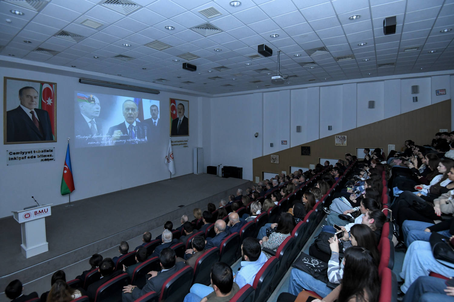 BMU-nun rektoru Yaqub Piriyev tədbirdə çıxış edərək ötən yüzilliyin ən görkəmli dövlət xadimlərindən Heydər Əliyevin həyat yolu və xalqımıza bəxş etdiyi zəngin irsin hər bir azərbaycanlı üçün qürur mənbəyi olduğunu deyib. Ümummilli Liderin 1970-80-ci illərdə Azərbaycanı keçmiş SSRİ-nin qabaqcıl respublikalarından birinə çevirdiyini vurğulayan rektor həmin dövrdə ölkəmizin əldə etdiyi uğurları statistik rəqəmlərlə diqqətə çatdırıb. Eyni zamanda sonrakı mərhələdə SSRİ Nazirlər Soveti sədrinin birinci müavini vəzifəsinə yüksələn Heydər Əliyevin nəqliyyat, rabitə, təhsil, səhiyyə, eləcə də digər sosial-mədəni istiqamətləri birləşdirən 14 nazirlik və sahəyə nəzarət etdiyini deyərək gördüyü genişmiqyaslı işləri yada salıb. Yaqub Piriyev 1993-cü ildə xalqın təkidli tələbi ilə hakimiyyətə qayıdan Heydər Əliyevin ölkədə ictimai-siyasi sabitliyin bərqərar olunması, sürətli iqtisadi islahatlar aparılması, nəhəng qlobal layihələrin həyata keçirilməsi, Azərbaycanın nəqliyyat və digər sahələr üzrə beynəlxalq tərəfdaşlığının genişlənməsindəki xidmətlərini nəzərə çatdırıb. Həmin strategiyanın davamı olaraq Prezident İlham Əliyevin rəhbərliyi ilə Azərbaycan üçün geniş imkanlar açan qlobal nəqliyyat və iqtisadi əməkdaşlıq layihələri vurğulanıb. Azərbaycanın Orta Dəhlizin həlqəsi kimi Çin-Avropa ticarətinin sürətlənməsində mühüm rol oynadığı, bütün bunların Ulu Öndərin “İpək Yolu” ideyasının davamı kimi qlobal əlaqələri genişləndirdiyi bildirilib.