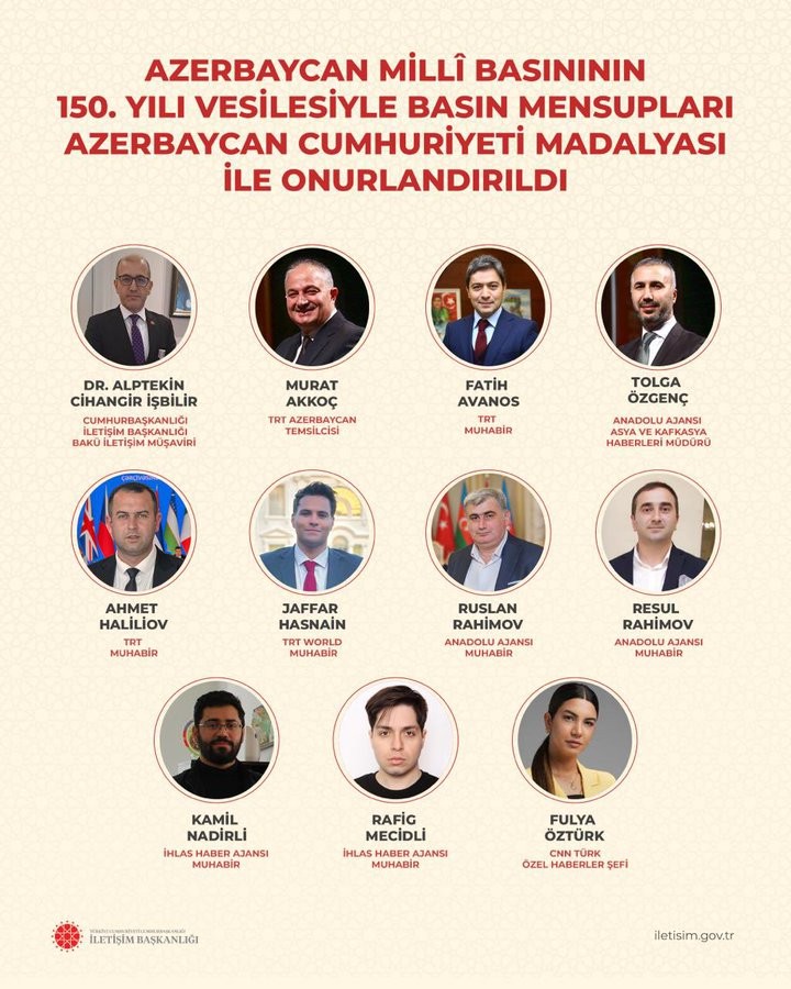 Qardaş Türkiyədən olan media nümayəndələri və tədqiqatçılar Azərbaycan milli mətbuatının 150 illik yubiley medalı ilə təltif ediliblər. Türkiyənin media nümayəndələrinin Azərbaycan Respublikasının Prezidentinin fərmanı ilə təsis olunan yubiley medalı ilə təltifı Azərbaycan və Türkiyə arasında media sahəsində uzun illərə söykənən qardaşlıq münasibətlərinin, qarşılıqlı etimadın və peşəkar əməkdaşlığın növbəti təzahürü və media sahəsində qardaşlıq nümunəsidir.