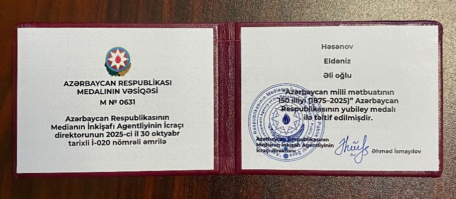 Azərbaycan Respublikasının Prezidenti İlham Əliyevin müvafiq fərmanı ilə təsis edilmiş “Azərbaycan Milli Mətbuatının 150 illiyi (1875–2025)” yubiley medalı uzunmüddətli və səmərəli fəaliyyəti, peşəkarlığı, operativ və obyektiv informasiya təminatında xidmətləri olan, habelə Azərbaycan milli mətbuatının inkişafına mühüm töhfələr vermiş şəxslərə təqdim olunur.