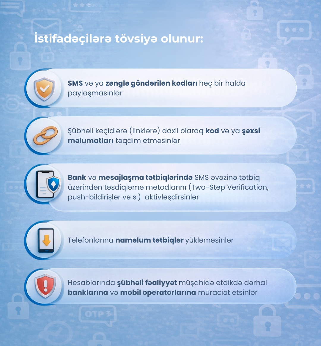 • Cihazınıza göndərilən kodları (SMS, OTP) heç kimlə paylaşmayın;