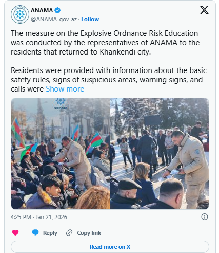 Azərbaycan Respublikasının Minatəmizləmə Agentliyi (ANAMA) Xankəndi şəhərinə qayıdan sakinlər üçün partlayıcı sursat riskləri ilə bağlı maarifləndirmə tədbiri keçirib.
