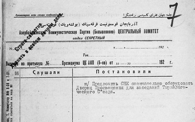 Azərbaycan Kommunist (bolşeviklər) Partiyası Mərkəzi Komitəsinin Rəyasət Heyətinin protokol çıxarışında tarix və protokol nömrəsi göstərilməsə də, Gizli şöbənin məxfi sənədinə əsasən Xalq Komissarları Sovetinə (XKS) təklif edilir ki, Türkoloji Qurultayın iclaslarının keçirilməsi üçün Maarif Sarayını (İsmailiyyənin binası – N.M.) tam şəkildə təchiz etsin.