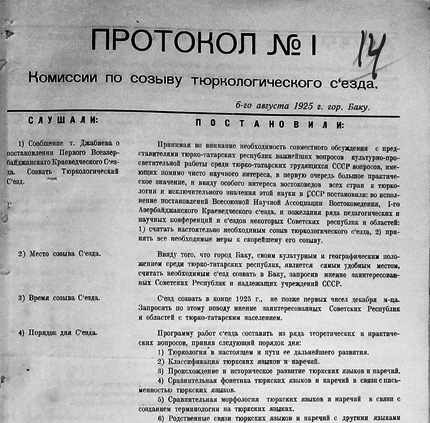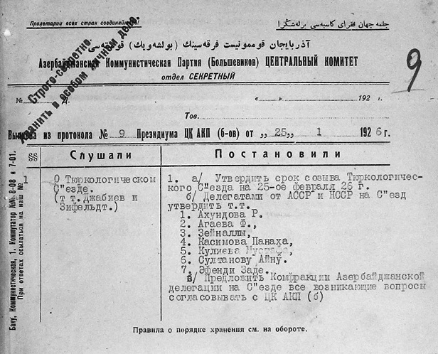 1926-cı il 25 yanvar tarixli tam məxfi protokol çıxarışı göstərir ki, artıq Türkoloji Qurultayın keçirilməsi ilə bağlı bütün əsas qərarlar yekunlaşdırılmış və rəsmiləşdirilmişdir. Məhz bu sənədlə: