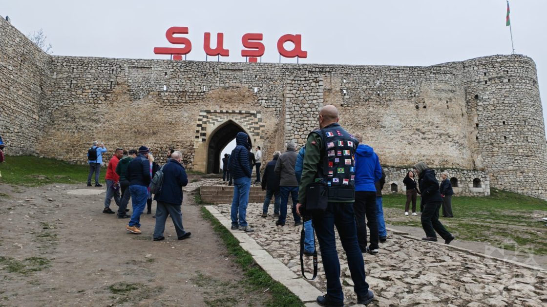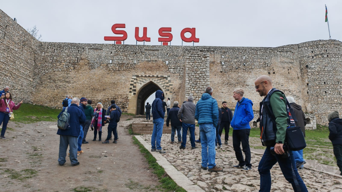 AZƏRTAC-ın bölgə müxbiri xəbər verir ki, 37 ölkədən 79 nəfər səyyahın daxil olduğu heyət əvvəlcə Şuşa şəhərinin mərkəzi meydanında Azərbaycanın tanınmış şəxsiyyətləri Natəvan, Bülbül və Üzeyir Hacıbəylinin güllələnmiş heykəllərinə baxıblar. Qonaqlara Şuşa şəhəri, onun işğal dövründəki vəziyyəti və burada həyata keçirilən yenidənqurma işləri barədə məlumat verilib. Bildirilib ki, otuzillik işğal dövründə Şuşa şəhərindəki tarixi binalar, məscidlər, abidələr erməni vandalizminə məruz qalıb. Şuşa işğaldan azad edildikdən sonra burada genişmiqyaslı bərpa-quruculuq işlərinə start verilib. İnfrastrukturun qurulması ilə yanaşı, Şuşada şəhərin əsl tarixi simasının, tarix və mədəniyyət abidələrinin bərpasına başlanılıb.