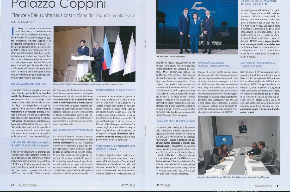 Məqalədə bildirilir ki, Palazzo Coppini, Fondazione Romualdo Del Bianco – Life Beyond Tourism təşəbbüsü ilə həyata keçirilən layihələr çərçivəsində Bakı “Sülh sənayesinin qurulması” ideyasının mühüm beynəlxalq platformalarından biri kimi çıxış edir. Xüsusilə müharibəni simvolizə edən metalın sülh rəmzinə çevrilməsi ideyasını daşıyan “Stupore 1945–2025” layihəsinin ilk beynəlxalq təqdimatı üçün Bakının və AzMİU-nun seçilməsi təsadüfi deyil.