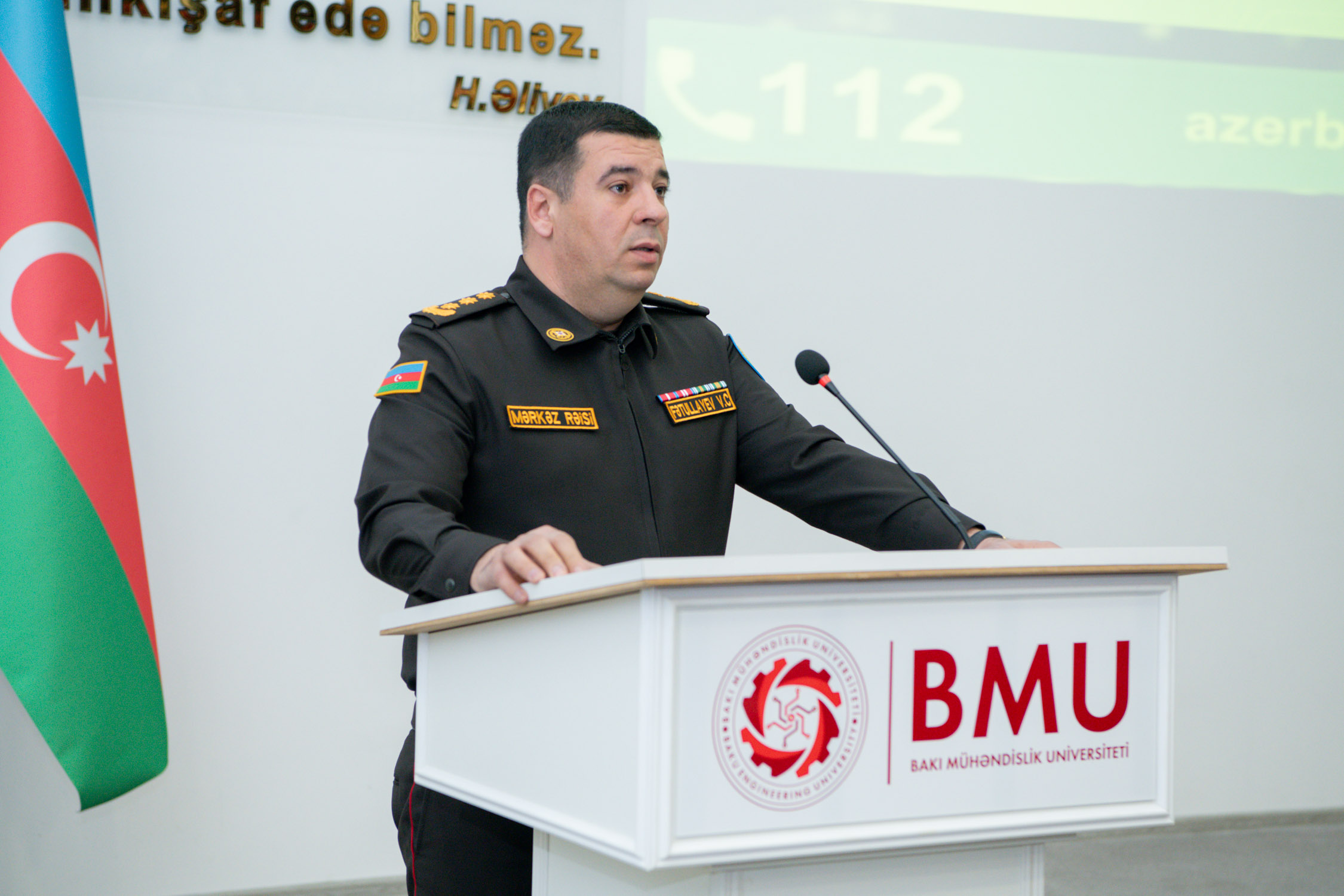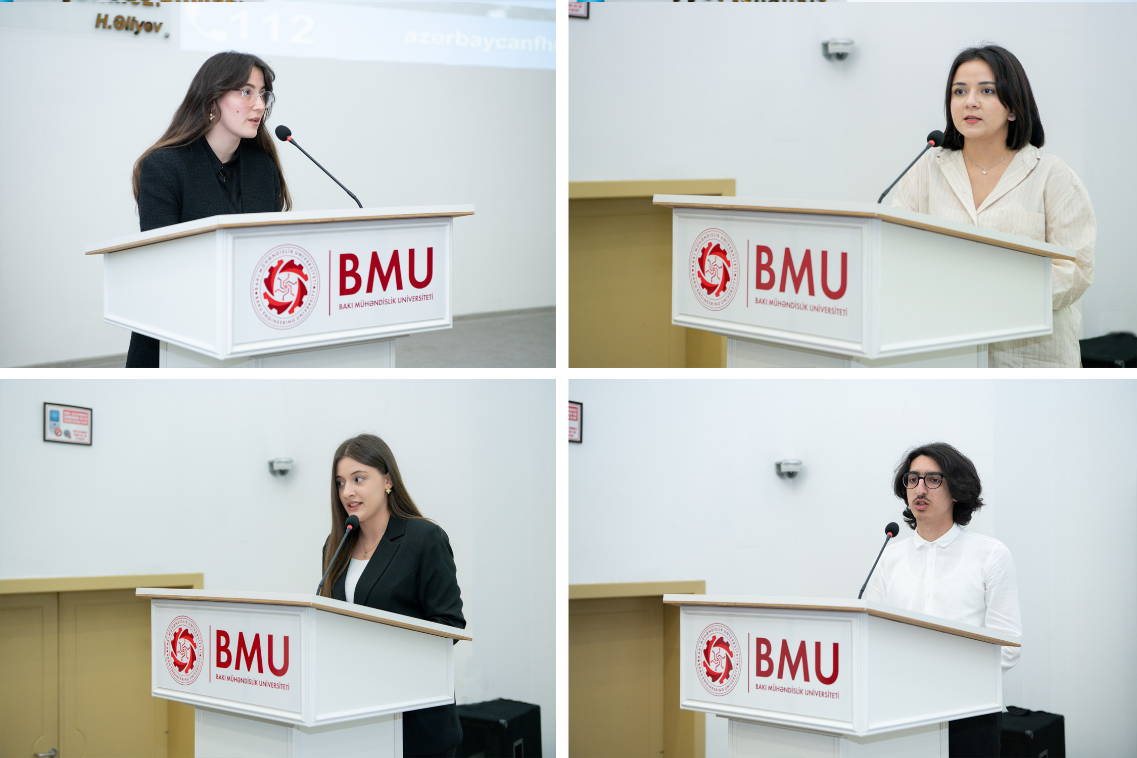 Sonra Abşeron rayon Dövlət yanğından mühafizə hissəsinin rəis müavini, daxili xidmət mayoru Elbrus Məhərrəmov, Sumqayıt Regional Mərkəzinin Ərazi orqanları ilə iş şöbəsinin baş məsləhətçisi Sabir Əsgərov, BMU-nun Ümumi fənlər kafedrasının baş müəllimi Yalçın Zeynalov və müəllimi Mirramin Yunusov, “Şəhərsalma” ixtisası üzrə IV kurs tələbəsi Aysu Cəbrayılova çıxış ediblər. Məruzəçilər fövqəladə halların idarəolunması, yanğın təhlükəsizliyi qaydaları, o cümlədən BMU-da yerli və əcnəbi tələbələr arasında mülki müdafiə sahəsində biliklərin artırılması və bu istiqamətdə aparılan maarifləndirmə tədbirləri haqda fikirlərini bölüşüblər. Çıxışlarda, həmçinin FHN-in “Fövqəladə hallar könüllüləri” proqramı haqda məlumat verilib və gənclərin bu proqramda aktiv iştirakı önə çəklib.