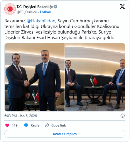Türkiyənin xarici işlər naziri Hakan Fidan Fransanın paytaxtı Parisdə suriyalı həmkarı Əsəd əl-Şeybani ilə görüşüb.
