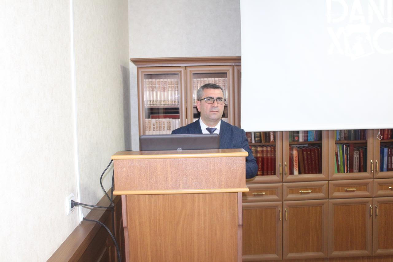 Daha sonra Tarix, Etnoqrafiya və Arxeologiya İnstitutunun aparıcı elmi işçisi, tarix üzrə fəlsəfə doktoru, dosent Asəf Orucov “Xocalı: soyqırımdan inkişafa doğru” mövzusunda məruzə edib. Məruzəçi Xocalı soyqırımı ərəfəsində bölgədə baş verən ictimai-siyasi prosesləri təhlil edib, faciənin səbəb və nəticələrini tarixi faktlar əsasında diqqətə çatdırıb. O, Prezident İlham Əliyevin rəhbərliyi ilə 44 günlük Vətən müharibəsində qazanılan tarixi Qələbənin ölkəmizin ərazi bütövlüyünün və suverenliyinin bərpasını təmin etdiyini vurğulayıb. Həmçinin lokal xarakterli antiterror tədbirləri nəticəsində dövlət suverenliyinin tam bərqərar olunduğunu qeyd edərək, bu mərhələnin Xocalı da daxil olmaqla işğaldan azad edilmiş ərazilərin sosial-iqtisadi və mədəni inkişafı üçün geniş perspektivlər açdığını bildirib. Məruzədə Xocalının zəngin tarixi-mədəni irsi, qədim yaşayış məskəni kimi regionun tarixində tutduğu mühüm yer xüsusi vurğulanıb.