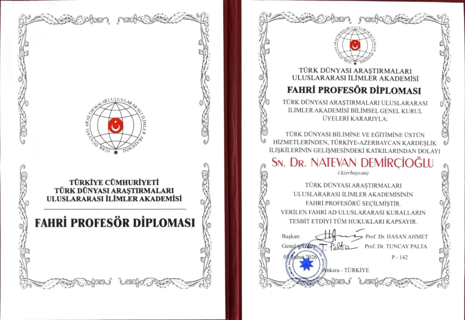 Azərbaycanlı yazıçı-publisist, filologiya üzrə fəlsəfə doktoru, Bakı Dövlət Universitetinin müəllimi Natəvan Dəmirçioğlu Türk Dünyası Araşdırmaları Beynəlxalq Elmlər Akademiyasının fəxri professoru seçilib. Eyni zamanda, alim beynəlxaq qızıl ulduz medalı ilə təltif olunub.