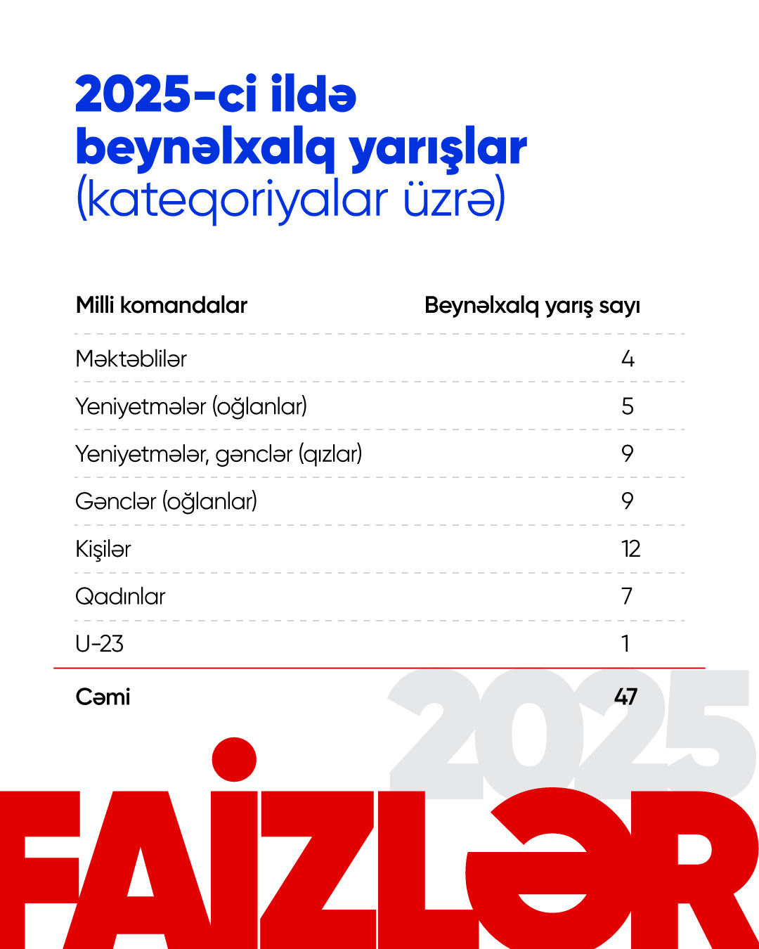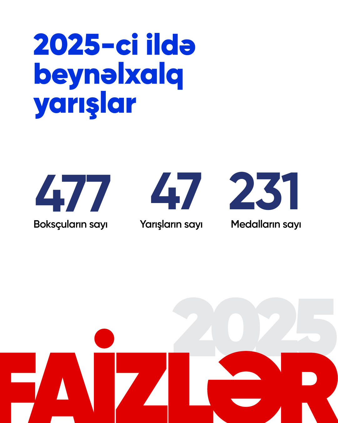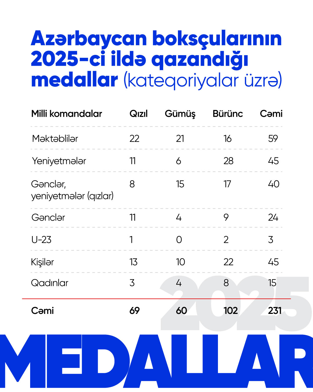 2025-ci il Azərbaycan boksu üçün uğurlu bir il kimi tarixdə qalacaq. Bu il müxtəlif yaş qrupları üzrə Azərbaycan milli komandaları 231 medal qazanıblar. Yığmalarımız bu mükafatları qatıldıqları 47 beynəlxalq yarışda əldə ediblər. Onlardan 69-u qızıl, 60-ı gümüş və 102-si bürüncdür. Nəticədə komandalarımızın nailiyyətləri ötən ilə müqayisədə 44 faiz artıb.