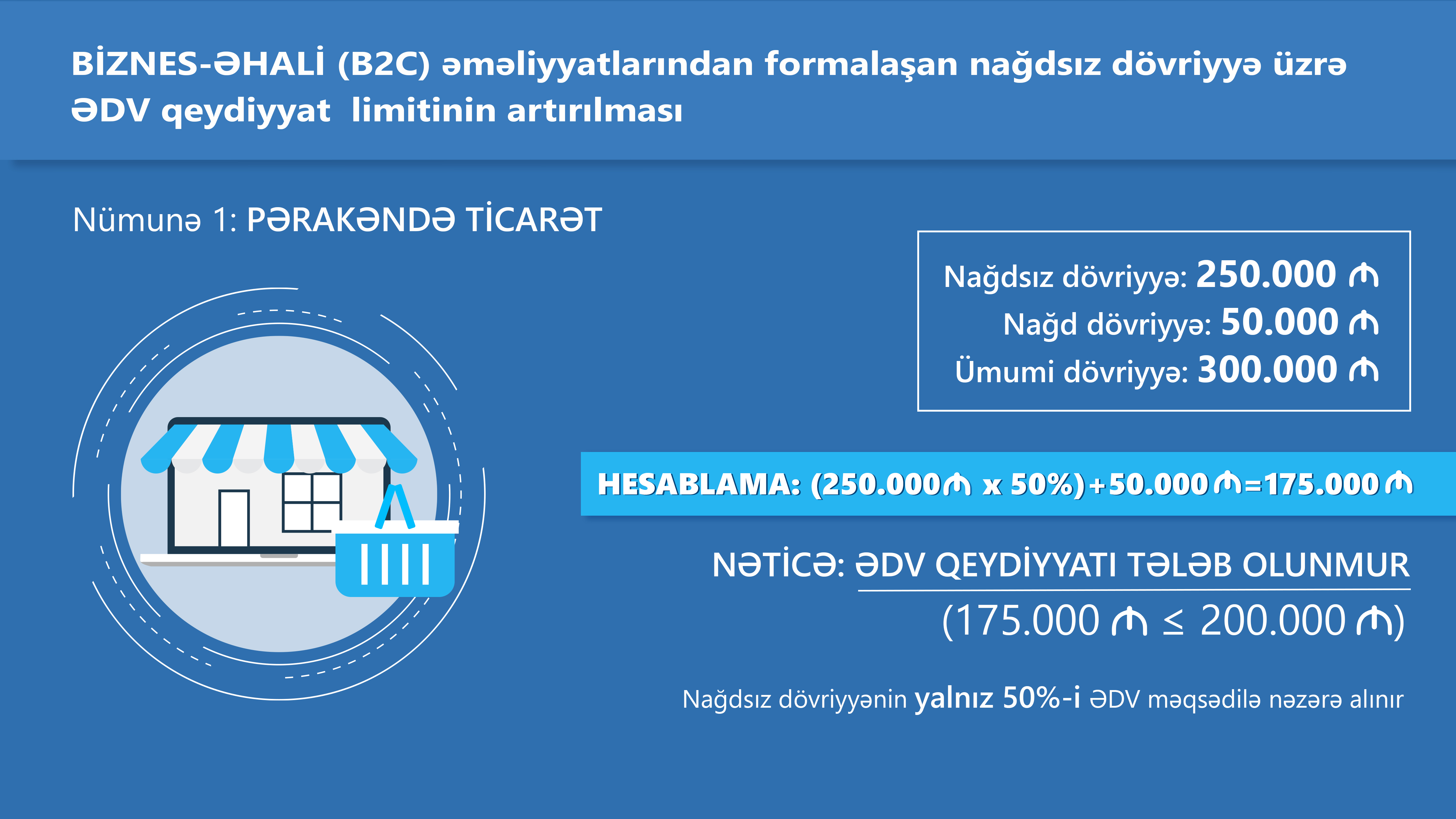 Pərakəndə ticarət fəaliyyəti ilə məşğul olan fərdi sahibkarın ardıcıl 12 aylıq dövr ərzində POS-terminal vasitəsilə nağdsız qaydada aparılan əməliyyatlar üzrə 250 min manat, nağd qaydada aparılan əməliyyatlar üzrə isə 50 min manat məbləğində dövriyyəsi formalaşıb. Fərdi sahibkarın ardıcıl 12 ay üzrə ümumi dövriyyəsi 300 min manat olsa da, təklif edilən dəyişikliyə görə, POS-terminal vasitəsilə nağdsız qaydada aparılan əməliyyatlar 50% nisbətində nəzərə alındığı üçün ƏDV məqsədləri üçün hesablanan dövriyyə 175 min manat məbləğində müəyyən ediləcək. Bu halda, vergi tutulan dövriyyə məbləği məcburi ƏDV qeydiyyat həddi olan 200 min manatdan aşağı olduğu üçün fərdi sahibkarın ƏDV məqsədləri üçün qeydiyyata alınmaq öhdəliyi yaranmır.