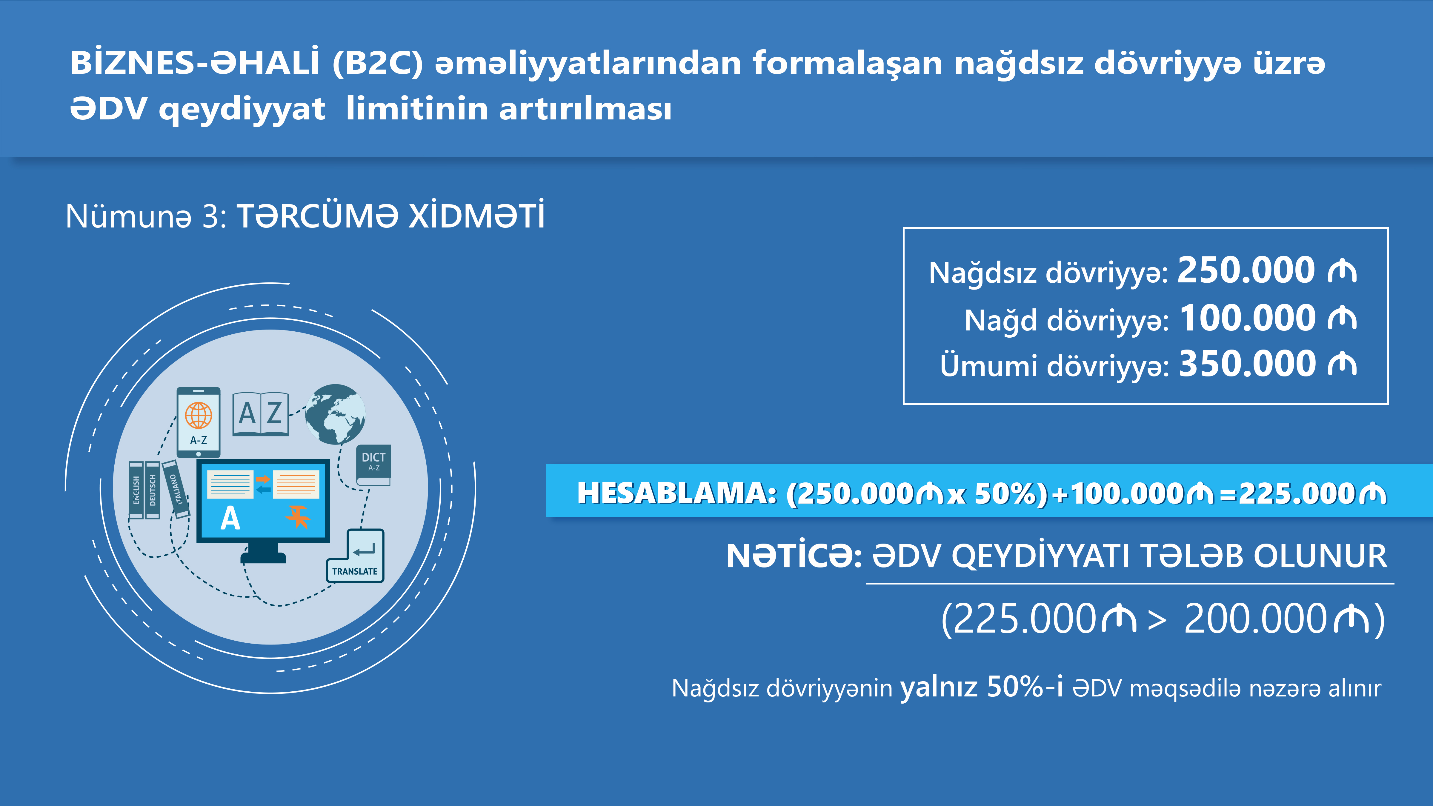 Vətəndaşlara tərcümə xidməti göstərən fərdi sahibkarın ardıcıl 12 aylıq dövr ərzində nağdsız qaydada POS-terminal vasitəsilə həyata keçirdiyi əməliyyatlar üzrə 250 min manat, nağd qaydada aparılan əməliyyatlar üzrə isə 100 min manat məbləğində dövriyyəsi formalaşıb. Fərdi sahibkarın ardıcıl 12 ay üzrə ümumi dövriyyəsi 350.000 manat olsa da, Vergi Məcəlləsinə təklif edilən dəyişikliyə əsasən, POS-terminal vasitəsilə nağdsız qaydada aparılan əməliyyatlar nəticəsində ƏDV məqsədləri üçün hesablanan dövriyyə 225.000 manat məbləğində müəyyən ediləcək. Bu halda vergi tutulan dövriyyə məbləği məcburi ƏDV qeydiyyat həddi olan 200.000 manatı keçdiyi üçün fərdi sahibkar məcburi qaydada ƏDV qeydiyyatına alınmalıdır.