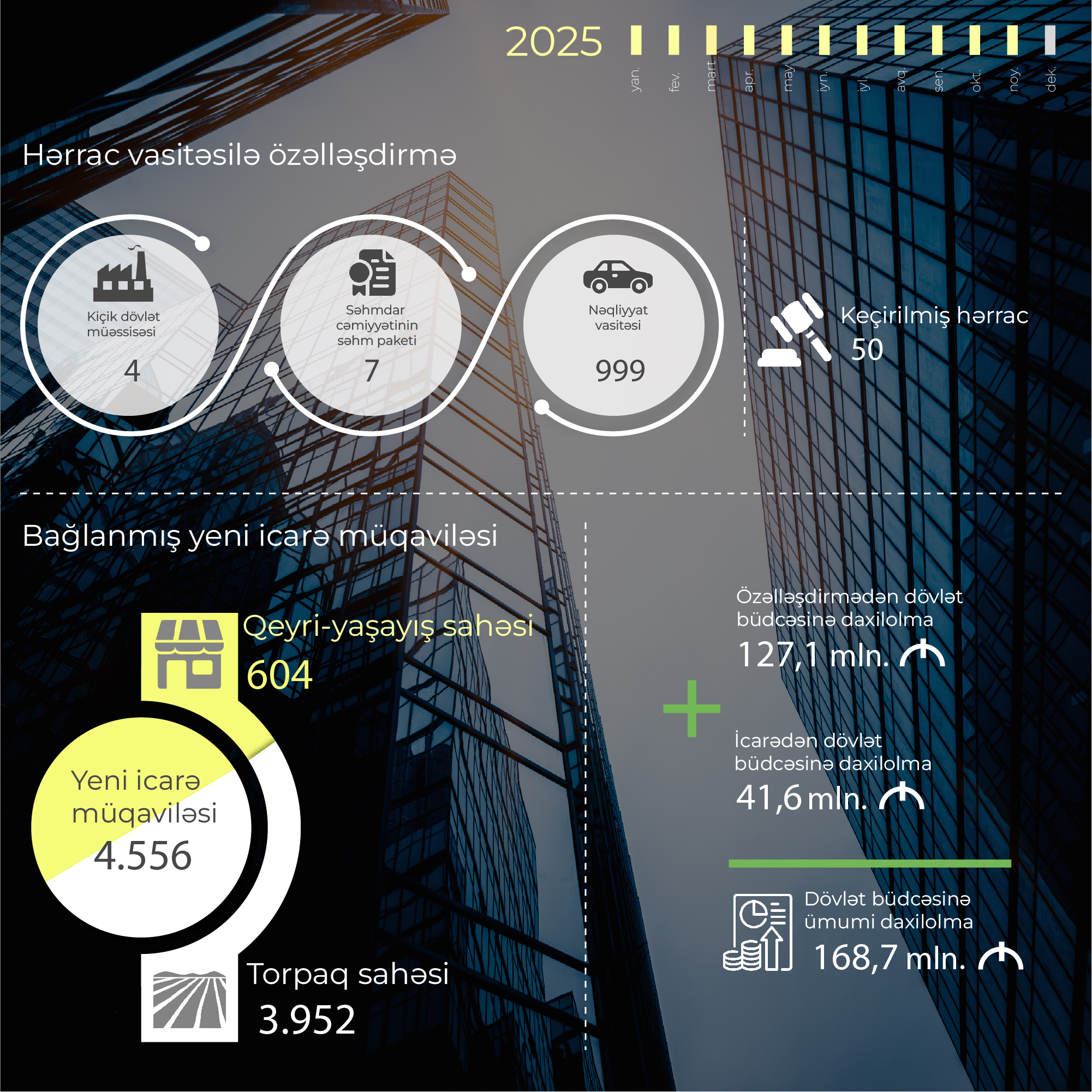Dövlət əmlakının özəlləşdirilməsi və icarəyə verilməsi sahəsində işlər davam edir. İqtisadiyyat Nazirliyi yanında Əmlak Məsələləri Dövlət Xidməti tərəfindən 2025-ci ilin yanvar-noyabr ayları ərzində 50 hərrac keçirilib. Hərraclarda 7 səhmdar cəmiyyətinin səhm paketi, 4 kiçik dövlət müəssisəsi, 1 yarımçıq tikili sahəsi, 999 nəqliyyat vasitəsi özəlləşdirilib.