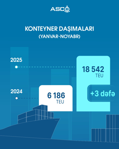 QSC-dən XQ-yə bildirilib ki, 2025-ci ilin yanvar–noyabrında ASCO gəmiləri ilə Orta Dəhliz üzrə 18 542 TEU konteyner daşınıb. Bu rəqəm ötən ilin eyni dövrü ilə müqayisədə təxminən 3 dəfə çoxdur.