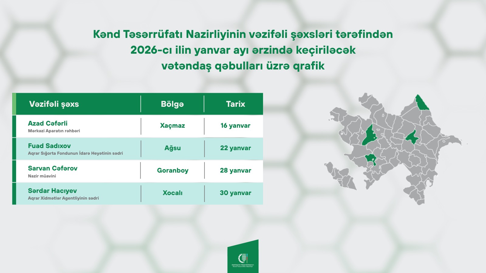 Kənd Təsərrüfatı Nazirliyinin vəzifəli şəxsləri tərəfindən 2026-cı ilin yanvar ayı ərzində keçiriləcək vətəndaş qəbulları üzrə qrafiki təqdim edirik.