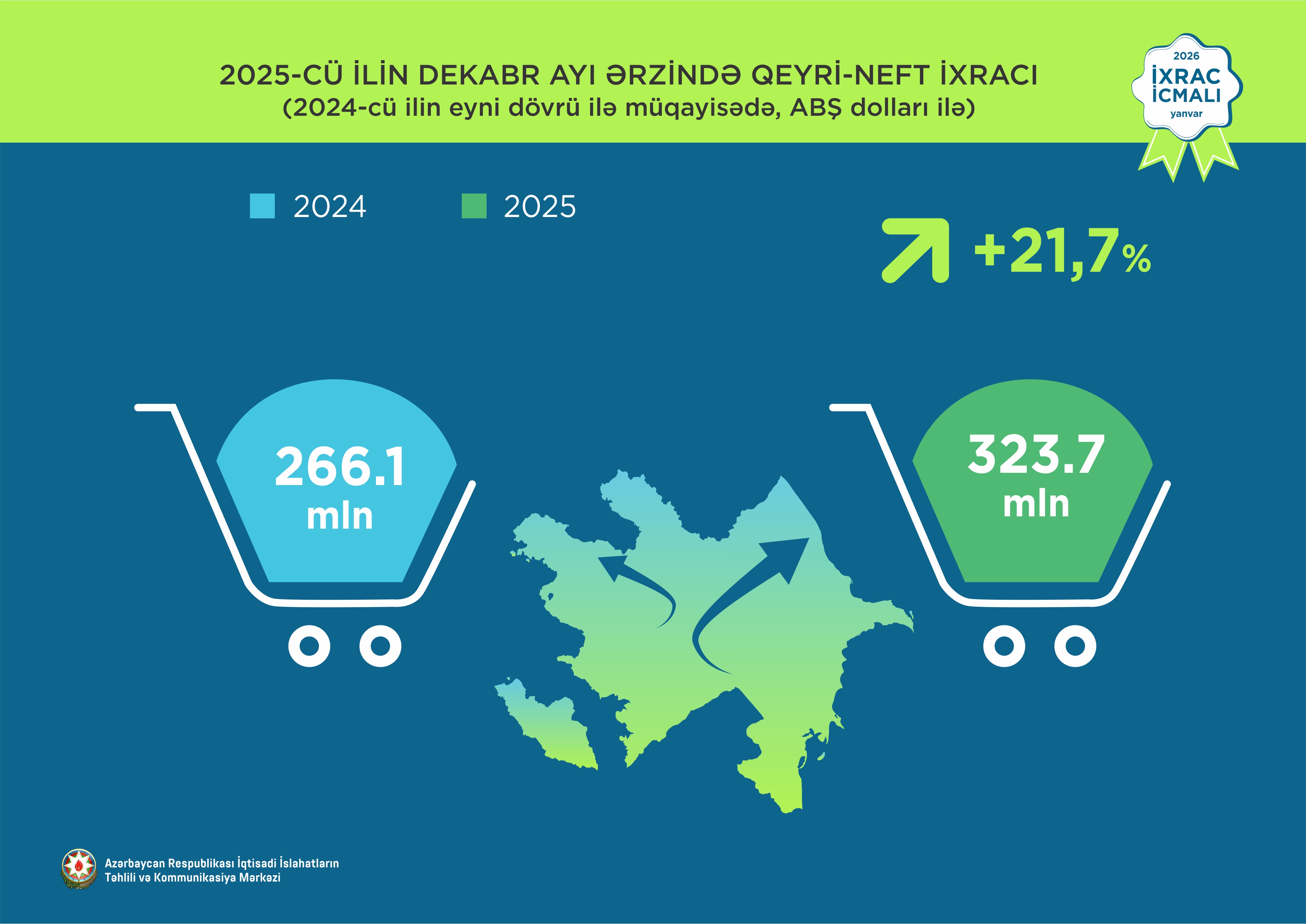 İqtisadi İslahatların Təhlili və Kommunikasiya Mərkəzi (İİTKM) “İxrac icmalı”nın 2026-cı ilin yanvar sayına dair ilkin rəqəmləri təqdim edib. İcmala əsasən, 2025-ci ilin yanvar-dekabr aylarında Azərbaycanın qeyri-neft sektoru üzrə ixracı 2024-cü ilin müvafiq dövrü ilə müqayisədə 8,5% artaraq 3,6 milyard ABŞ dolları təşkil edib. 2025-ci ilin yanvar-dekabr aylarında yeyinti məhsulları üzrə ixrac 18,4% artaraq 1,2 milyard ABŞ dollarına bərabər olub.