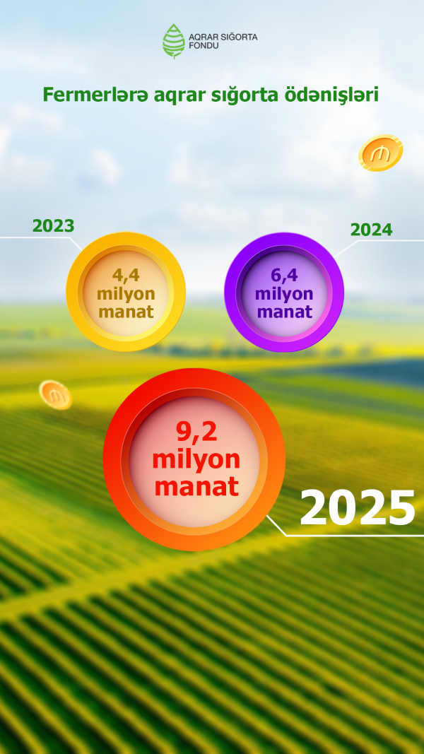 2025-ci ildə əkin sahələrində baş verən hadisələr üzrə fermer və təsərrüfatlara 8,8 milyon manat sığorta ödəniş edilib. Bu 2024-cü illə müqayisədə 70%, 2023-cü ildəki ödənişlərə nisbətən 2,5 dəfə artıqdır.