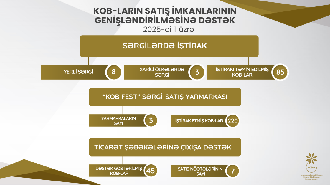 Kiçik və Orta Biznesin İnkişafı Agentliyi (KOBİA) tərəfindən təmin edilən KOB subyektlərinin satış imkanlarının genişləndirilməsinə dəstək mexanizmlərindən 2025-ci ildə 350 mikro, kiçik və orta biznes subyekti yararlanıb.