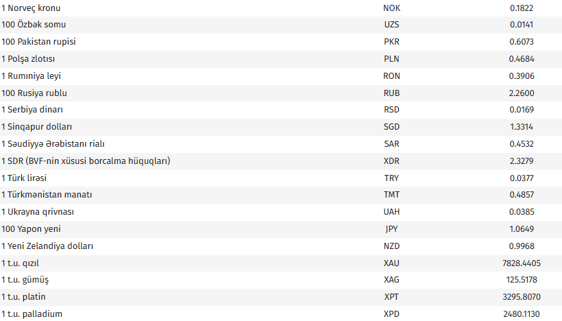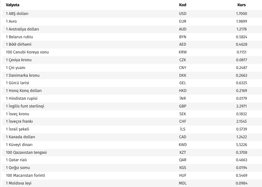 Azərbaycan Mərkəzi Bankının bu günə olan rəsmi valyuta məzənnələrinə əsasən, ABŞ dollarının məzənnəsi dəyişməyərək 1,7000 manat olub.