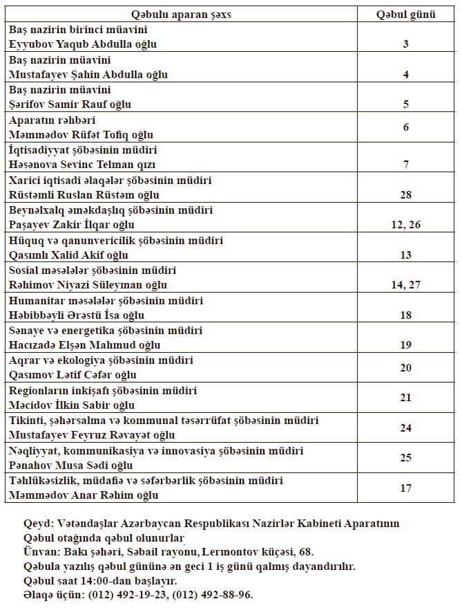 Azərbaycan Respublikası Nazirlər Kabinetinin Aparatında 2025-ci ilin noyabr ayında vətəndaşların qəbulu cədvəli