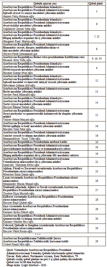 Azərbaycan Respublikası Prezidenti Administrasiyasının Vətəndaş Qəbulu Mərkəzində 2026-cı ilin yanvar ayında vətəndaşların qəbulu cədvəli